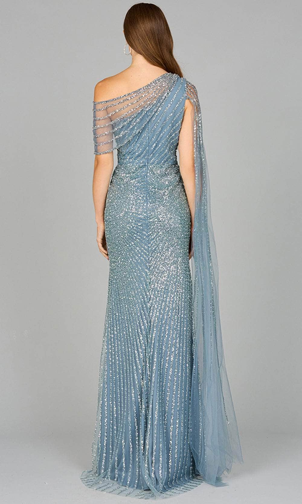 Embrace your inner diva with this classy Lara Dresses 29051 masterpiece. The one-shoulder design immediately draws attention with its glistening linear beaded adornment throughout the fitted bodice. Features include the long sheer cape that contrasts beautifully with the drape off-shoulder sleeve and asymmetric neckline. Finished off with a small train, the skirt elegantly forms a sheath silhouette that compliments your figure. Get noticed in this radiant creation from Lara Dresses 29051. Model is wearing Slate color.