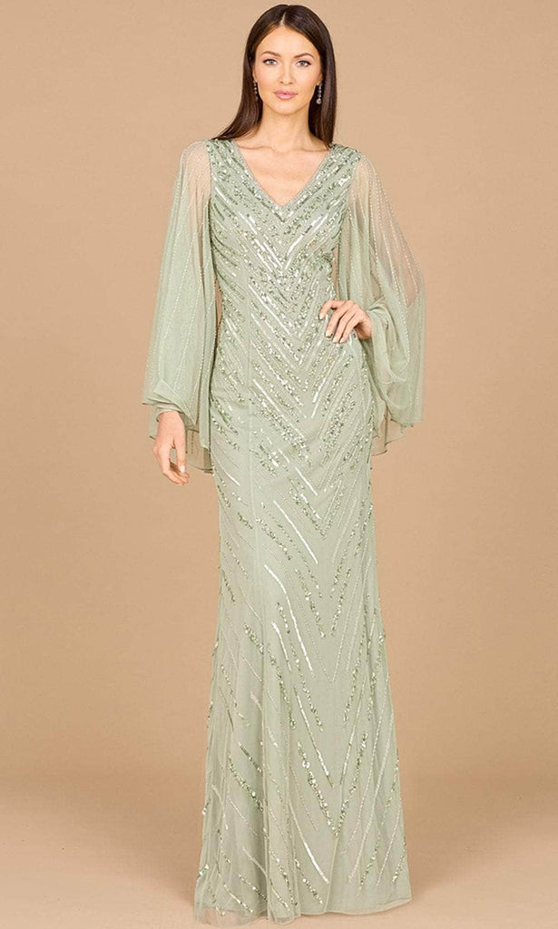 Flatter your finest assets as you enthrall the crowd in this Lara Dresses 29082 creation. This timeless outfit is ornate with sequin and beads that scattered gracefully across the fitted bodice. A stunning mirrored v-neckline and v-open back are featured. It is heightened by sheer long cape sleeves that drop softly on the arms. The skirt parades a sheath silhouette that beautifully descends to the floor length hemline. This Lara Dresses 29082 evening gown will not let anyone miss your grand entrance. Model is wearing the Dusty Mint color.