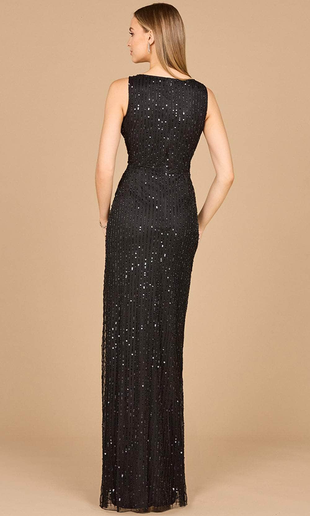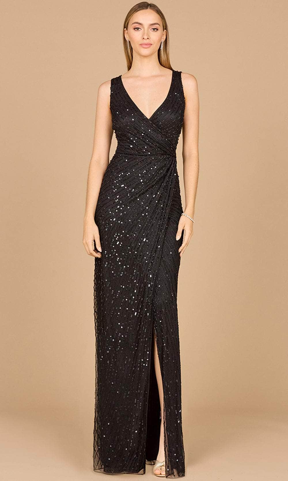 Get the party started in this remarkable evening gown from Lara Dresses 29096. This sleeveless ensemble highlights the faux wrap bodice that perfectly enhances your curves. It is embellished with beading and sequins from head to toe that shimmer with each step you take. Stunning deep v-neckline, wide shoulder straps and full back secures by zipper closure are displayed. The sultry high slit and floor-length sheath silhouette finishes this look. Radiate class and poise in this timeless Lara Dresses 29096 masterpiece. Model is wearing the Black color.