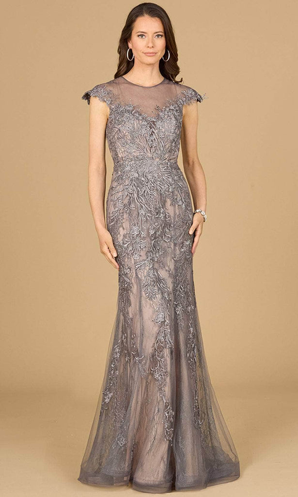 Show off your exceptional style in this stunning evening gown by Lara Dresses 29134. Adorned with intricate patterns of lace embroidery and glittering beads, this ensemble catches everyone's attention. It has an exquisite illusion jewel neckline and cap sleeves, complemented by a partial illusion full back for a sultry touch. The skirt falls smoothly to the floor in a sheath style, ending in a horsehair hem and sweeping train. This Lara Dresses 29134 creation is sure to display your natural beauty and grace. Model is wearing the Charcoal color.