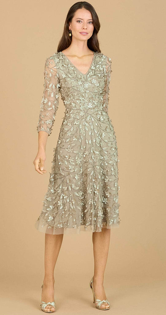 Every detail of this Lara Dresses 29184 is dripping with faultless charm. Fully adorns with rich beadwork and 3D cutout embroidery, this mesmerizing dress displays a v-neckline and a sheer quarter sleeve. This also comes with a full back and a center zipper for closing. The skirt flares a delightful A-line silhouette and runs in a tea length hem. Be the ultimate belle of the party in this gorgeous creation from Lara Dresses 29184. Model is wearing the Sage color.