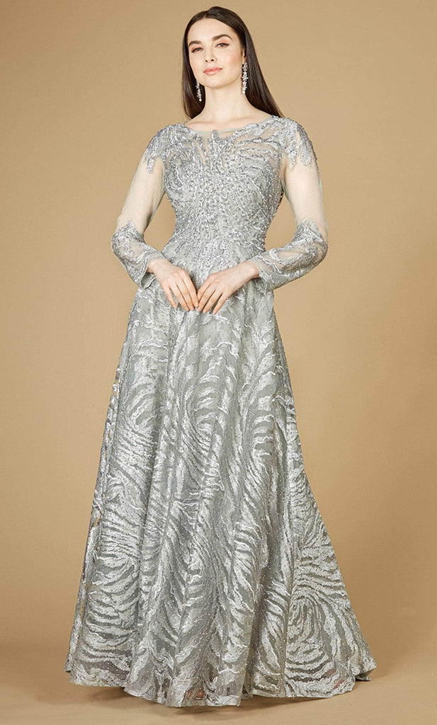 Dress to impress at your next formal event in this enthralling Lara Dresses 29231 design. Fully embroidered with silver details and beads, this dress has the perfect amount of glitz and glamour as it is designed with shimmering embellishments. It has a bateau neckline paired with a lovely sheer long sleeves and modest style. The back zipper holds the dress and secures a perfect fit. The skirt falls from your natural waistline and flows in A-line silhouette before ending in a dramatic train. Get smitten in a romantic piece from this Lara Dresses 29231 ensemble. Model is wearing the Slate color.