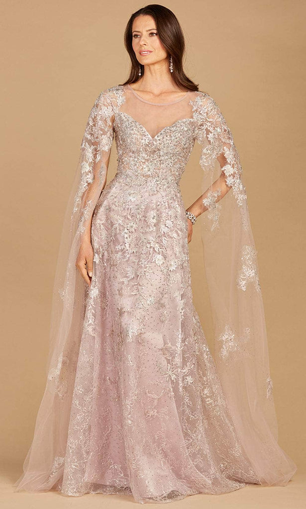 Let your fashion choices reflect your stylish flair in this Lara Dresses 29300 creation. Accented with a glittered lace adorned with fine embroideries and beading, this beauty shows an illusion bateau neckline with a sweetheart lining and flowy angel cape. Designed with sheer accents, the skirt streams into a floor length A-line silhouette and a sweeping train. The back is secured with a concealed zipper at the center for a proper fit. Shimmer like a ray of sunbeam as all eyes draw towards you in this Lara Dresses masterpiece. Model is wearing Light Mauve color.