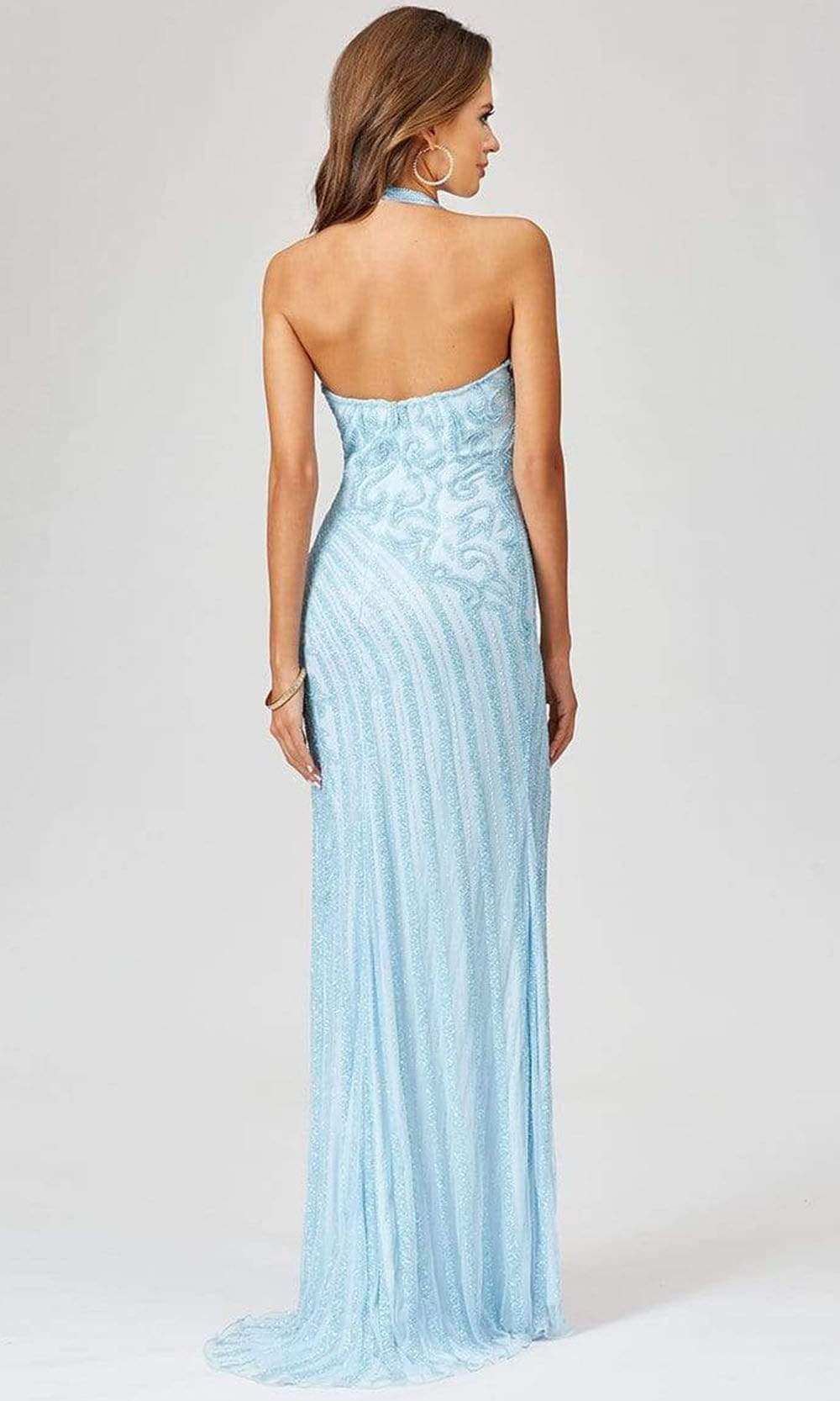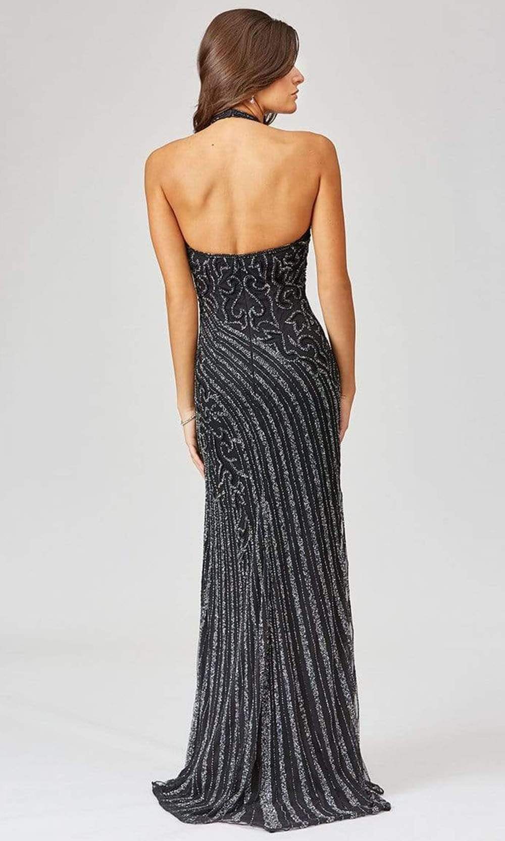 Be strikingly gorgeous in this stunningly adorned long dress by Lara 29371. This dress is designed with a halter neckline and mid-open back. The dress is adorned with patterned beaded details in full-length sheath silhouette with a thigh-high leg slit. This style from Lara Dresses is a definition of glamour.
