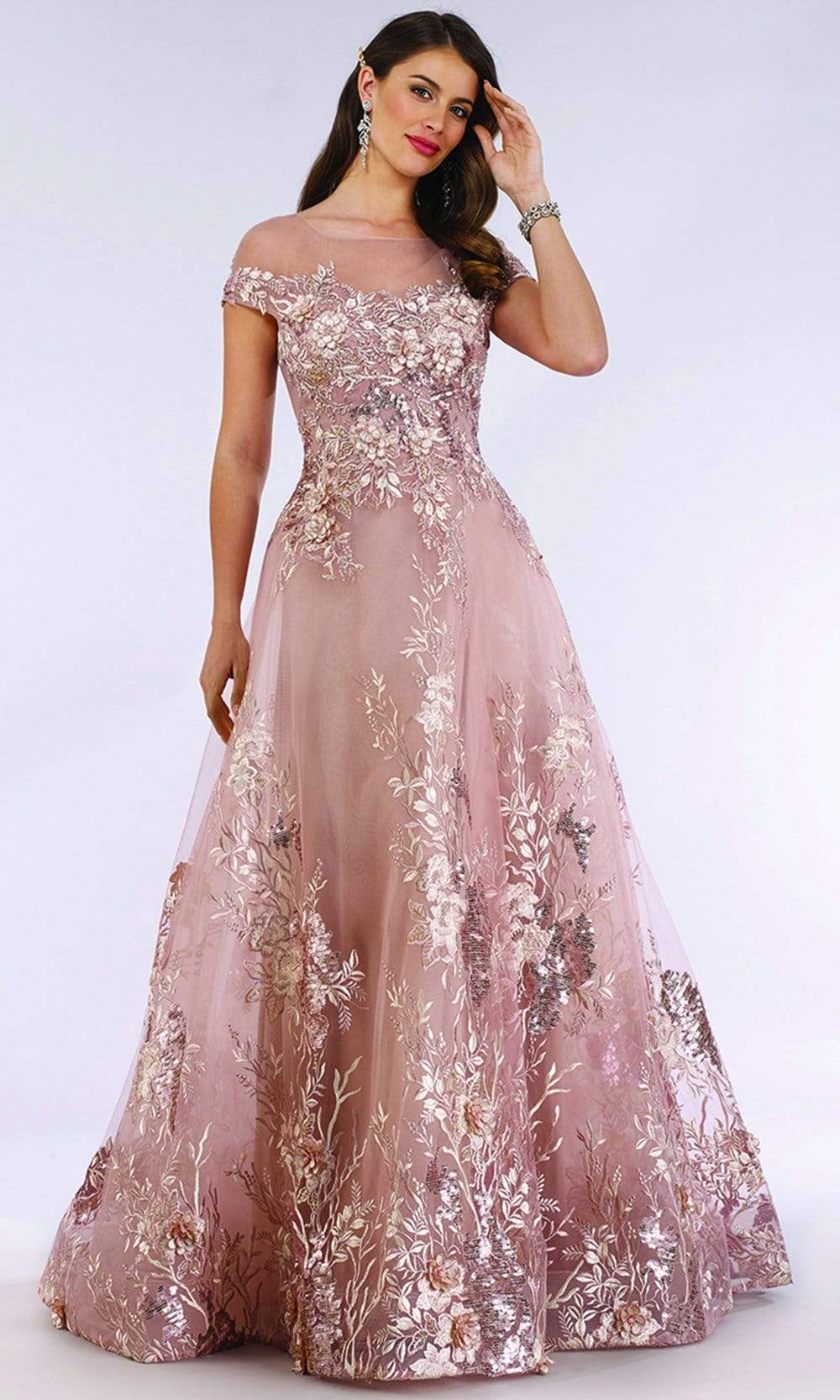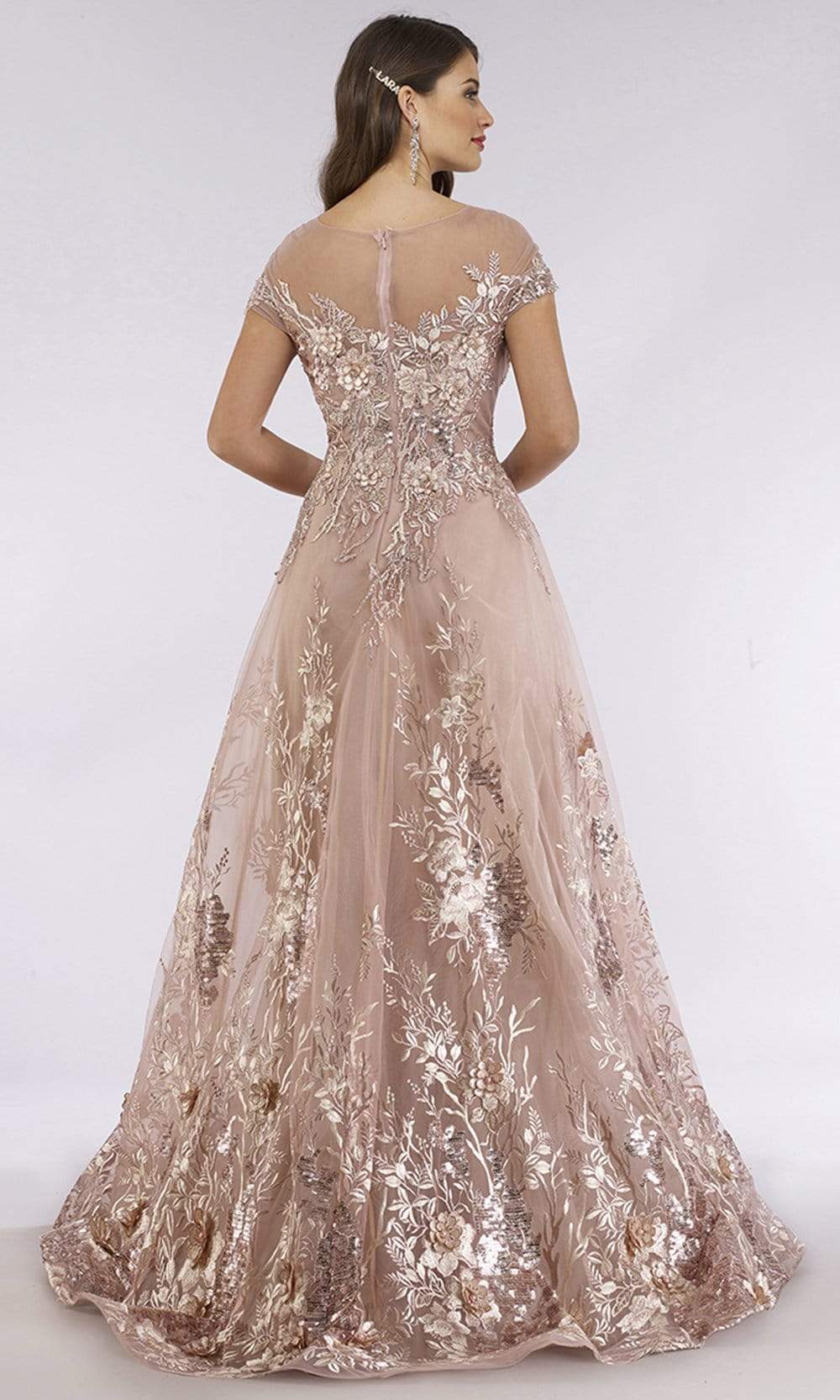 Get noticed in any crowd wearing this ensemble by Lara 29619. Glams in an illusion bateau neckline with short sleeves. The dress is ornate with floral appliques. The back has a zipper closure and from the waist fashions an A-line skirt with a sweep train finish. This Lara creation is truly remarkable!