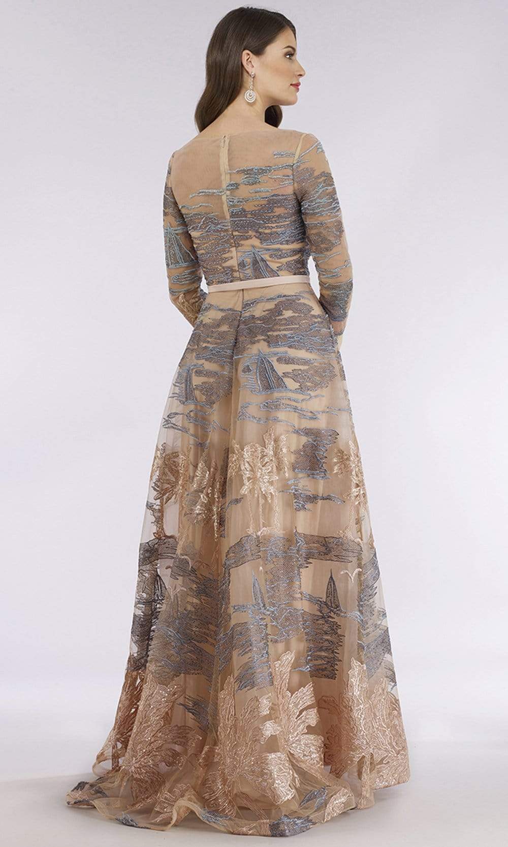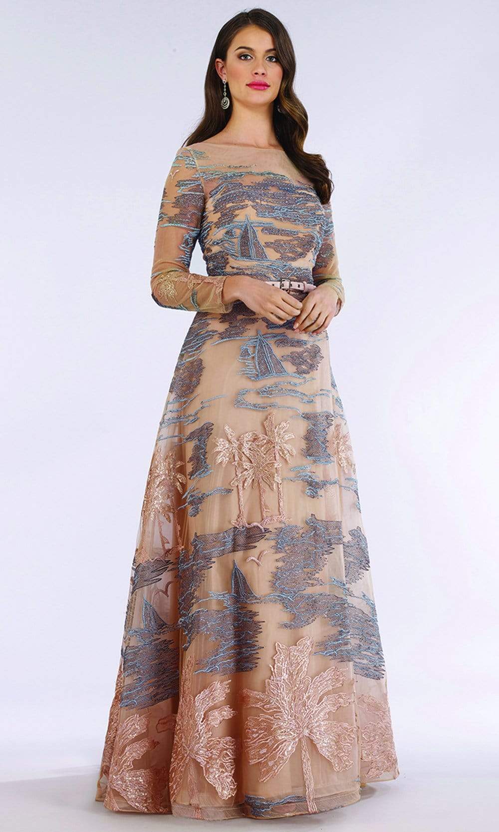 Look chic and seductive in this marvelous dress by Lara 29640. This embroidered dress features an illusion bateau neckline with long sleeves. The fitted bodice has a back zipper closure and cinched in a belt. From the waist flourishes a full length A-line skirt with a sweep train finish. Turn heads instantly when you wear this Lara dress.