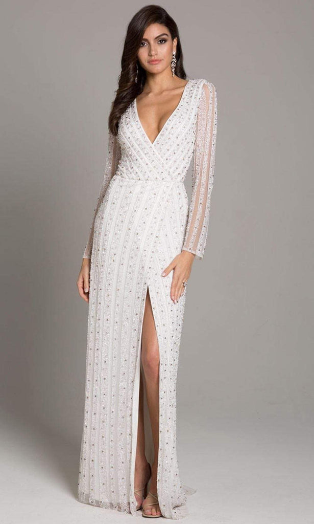 | Details: | Plunging neckline, Long sleeves, Fitted bodice, Sheath skirt, Slit, Train, Beading |