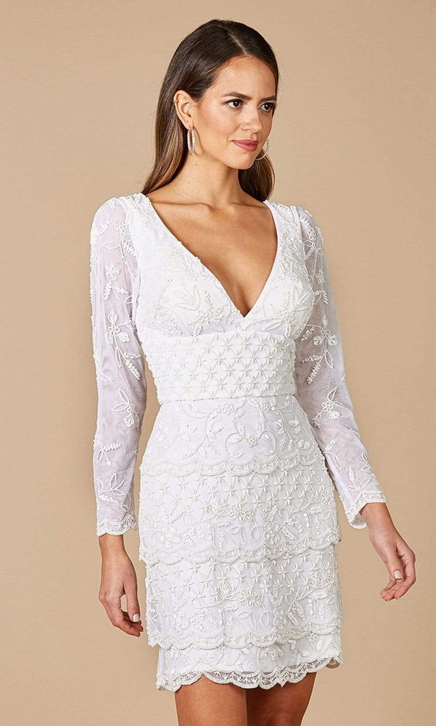 Details: Long Sleeves, Beaded, Tiered, Full Back, Back Zipper