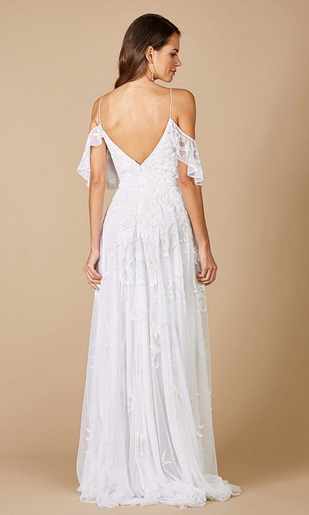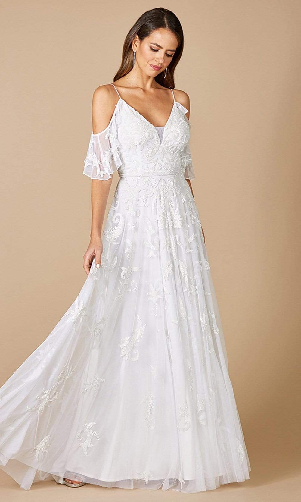 Stand out in every occasion with this Lara Dresses 51064 evening dress. This dress fashions a plunging V-neckline supported by spaghetti straps and half flutter sleeves with cold shoulders. Revealing an A-Line silhouette, this also shows a V back with back zipper closure in a beaded and appliqued bodice. Get glamorous look with this Lara Dresses creation. Model is wearing Ivory color.