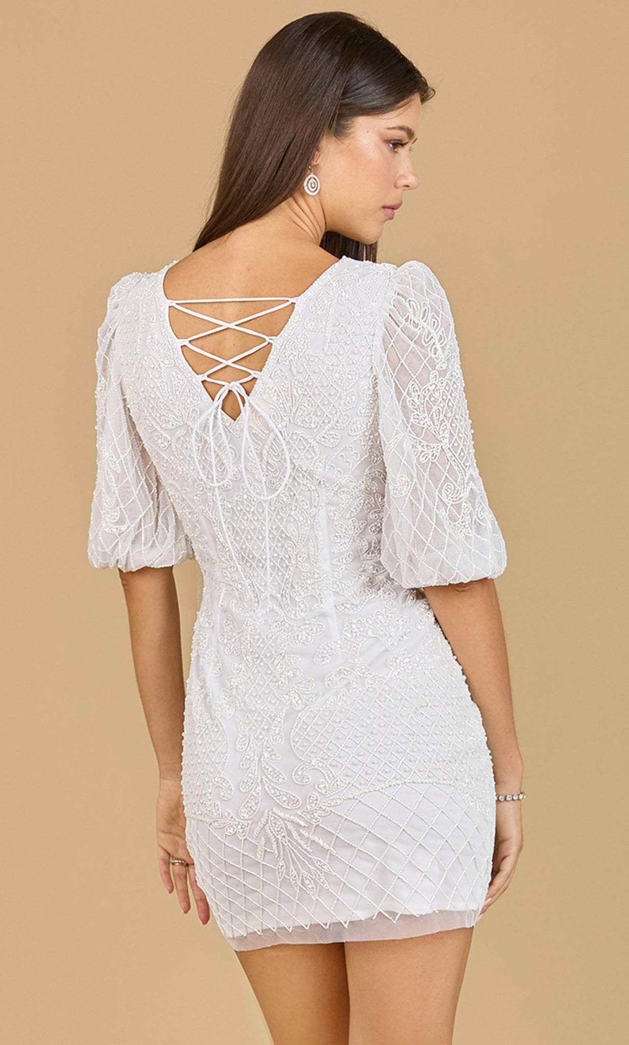 Claim that look of sophistication wearing this classy Lara Dresses 51118 bridal creation on your special day. Embellished with a spectacle of intricate beadwork allover its length, this bridal beauty charms with a deep v-neckline and a sheer tonal inset. Flanked with elbow length puff sleeves, the back is accentuated with a deep v-open style and a lace up detail. The sheath skirt sculpts along the curves as it ends with a mini hemline. Create a distinction with a regal flair in this exquisite on your wedding day in this Lara Dresses bridal masterpiece. Model is wearing the Ivory color.