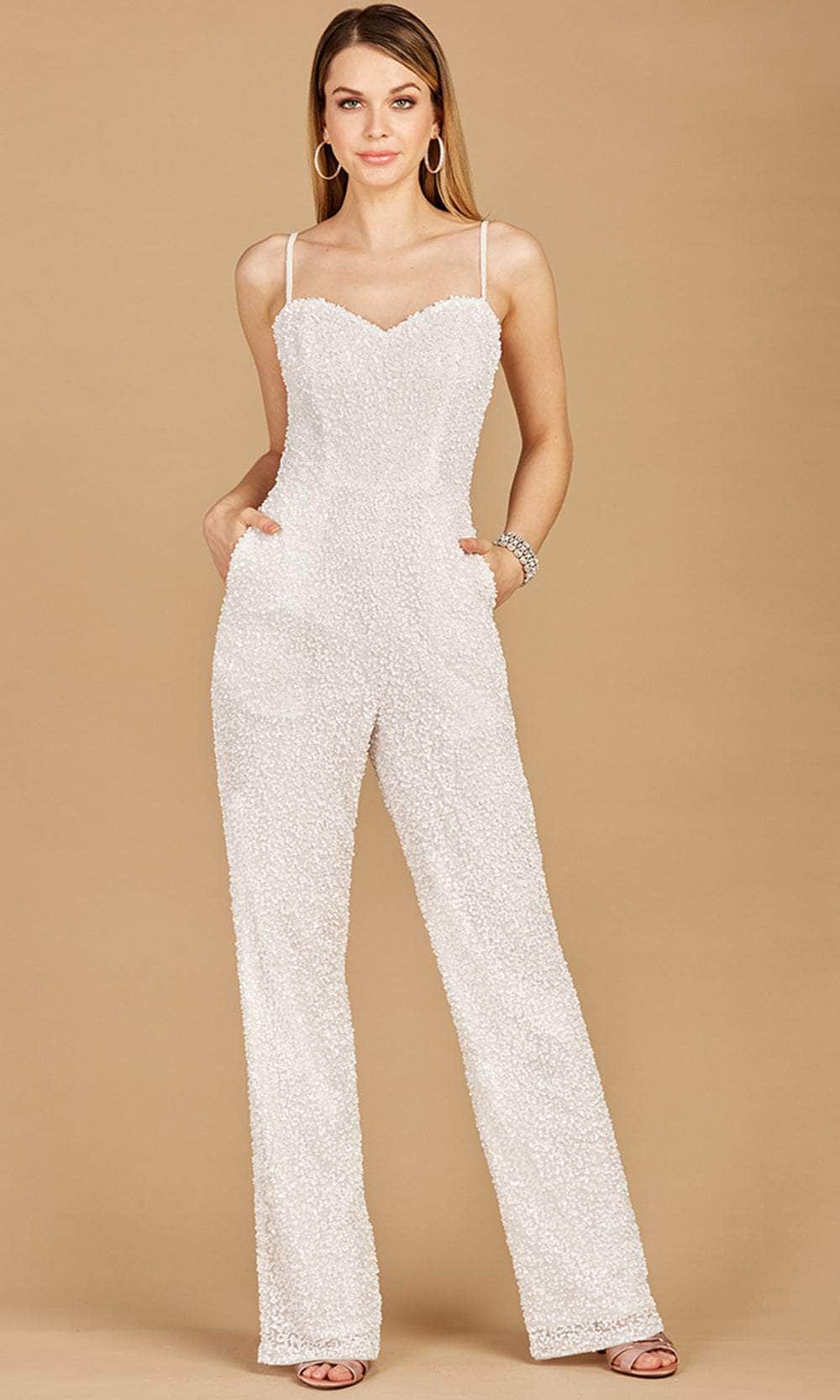 Get ready for everyone to stop and stare when you show up in this Lara Dresses 51122 masterpiece. Stunning with its shower of sequins all throughout on a mesh fabric. Tailored with a princess seam bodice, this sleeveless beauty graces with a sweetheart neckline, slim supporting straps extending to the mid open back with a zipper closure at the center for a flawless fit. Completing the look is a full length jumpsuit pants with a side pocket to keep your valuables. This Lara Dresses 51122 creation is a brilliant look for anyone who wants to stand out at the party. model is wearing Ivory color. Find more Formal Pantsuits.