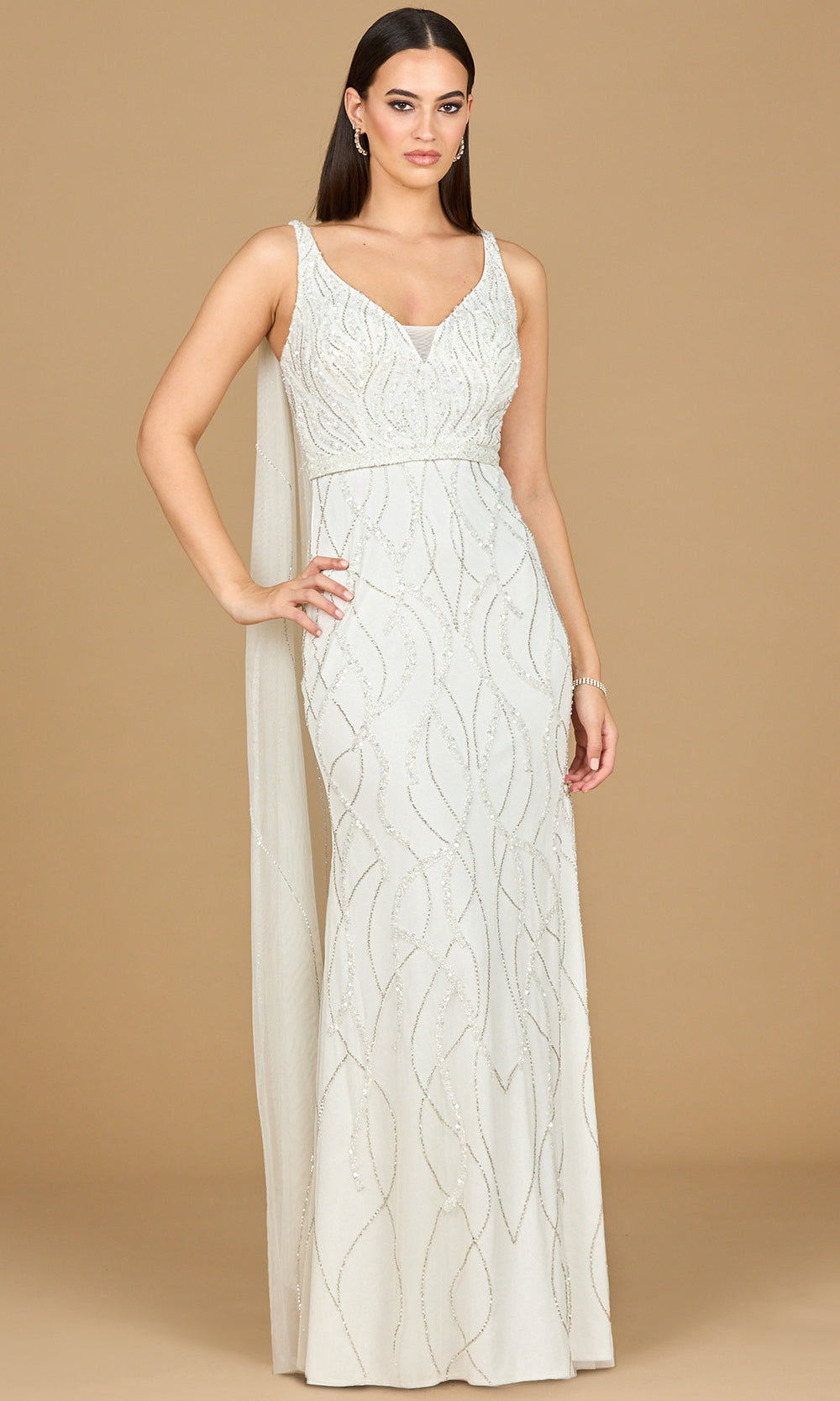 Radiating quiet sophistication, Lara Dresses 51214 blends graceful beadwork with a silhouette designed to elongate and flatter. The plunging V-neckline draws focus to the collarbone, while the beaded motifs flow seamlessly across the gown for a captivating look. The floor-length sheath design enhances elegance and movement, while a defined thin waistband maintains balance and proportion. Enhanced by a cascading cape at the back for a graceful and striking effect. Ideal for galas and formal celebrations, Lara Dresses 51214 evokes timeless elegance with every shimmering detail. Model is wearing Ivory color.