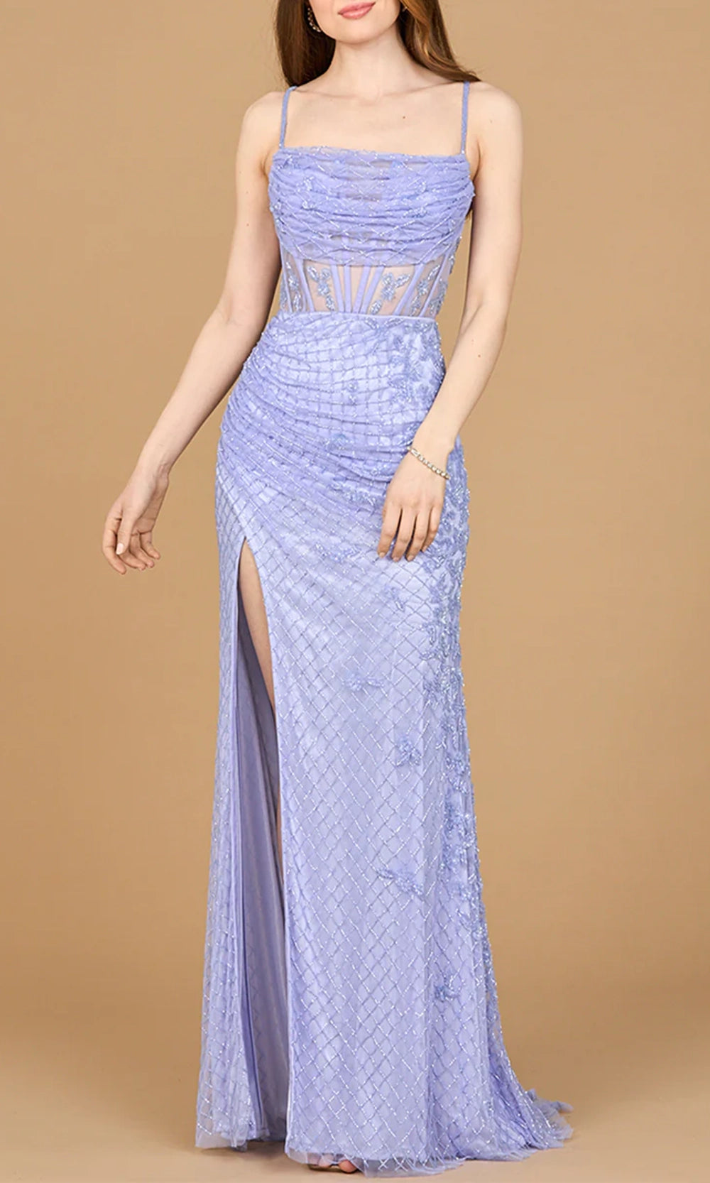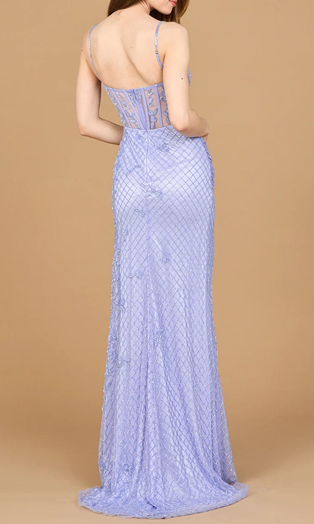 | Details: | Spaghetti Straps, Illusion Corset Bodice, Side Slit, Fitted Long Skirt, Beaded |