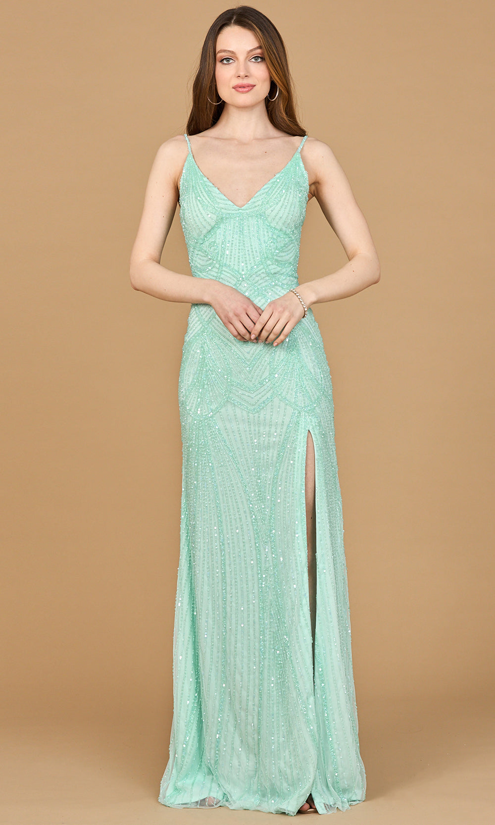 Grace every occasion with the radiance of Lara Dresses 9926. The gown features a sleek V-neckline with slim spaghetti straps that complement its delicately detailed bodice. Covered in intricate beading that sparkles under the light, this fitted sheath silhouette enhances natural curves while maintaining a refined finish. The high slit adds movement and allure, ensuring you exude confidence with every step. Designed for galas, pageants, or sophisticated evenings, the Lara Dresses 9926 is an unforgettable expression of classic beauty and contemporary design. Models are wearing Silver, and Tiffany colors.