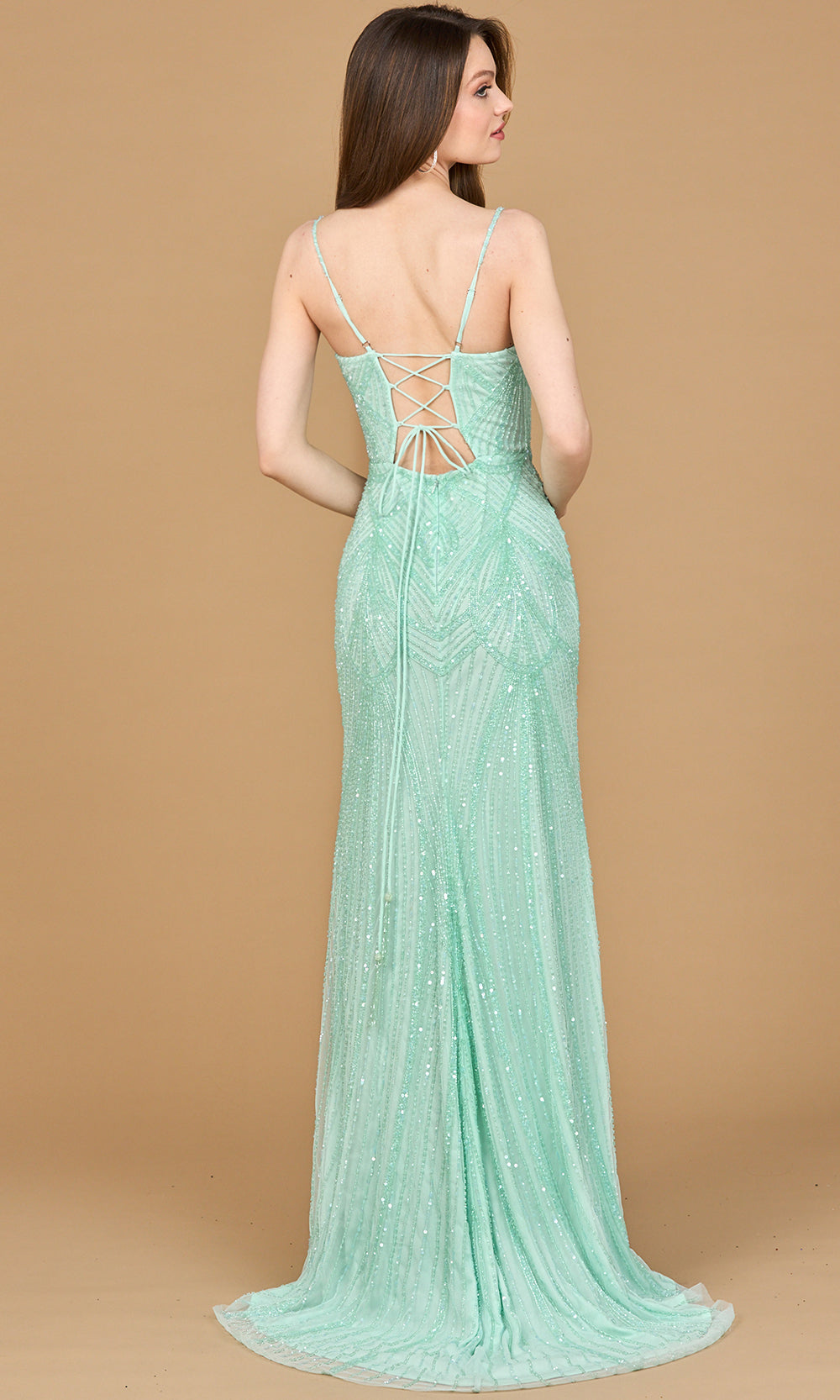 | Details: | Fitted Bodice, Spaghetti Straps, Sparkling Beadwork, Side Slit, Open Lace-Up Back, Train |