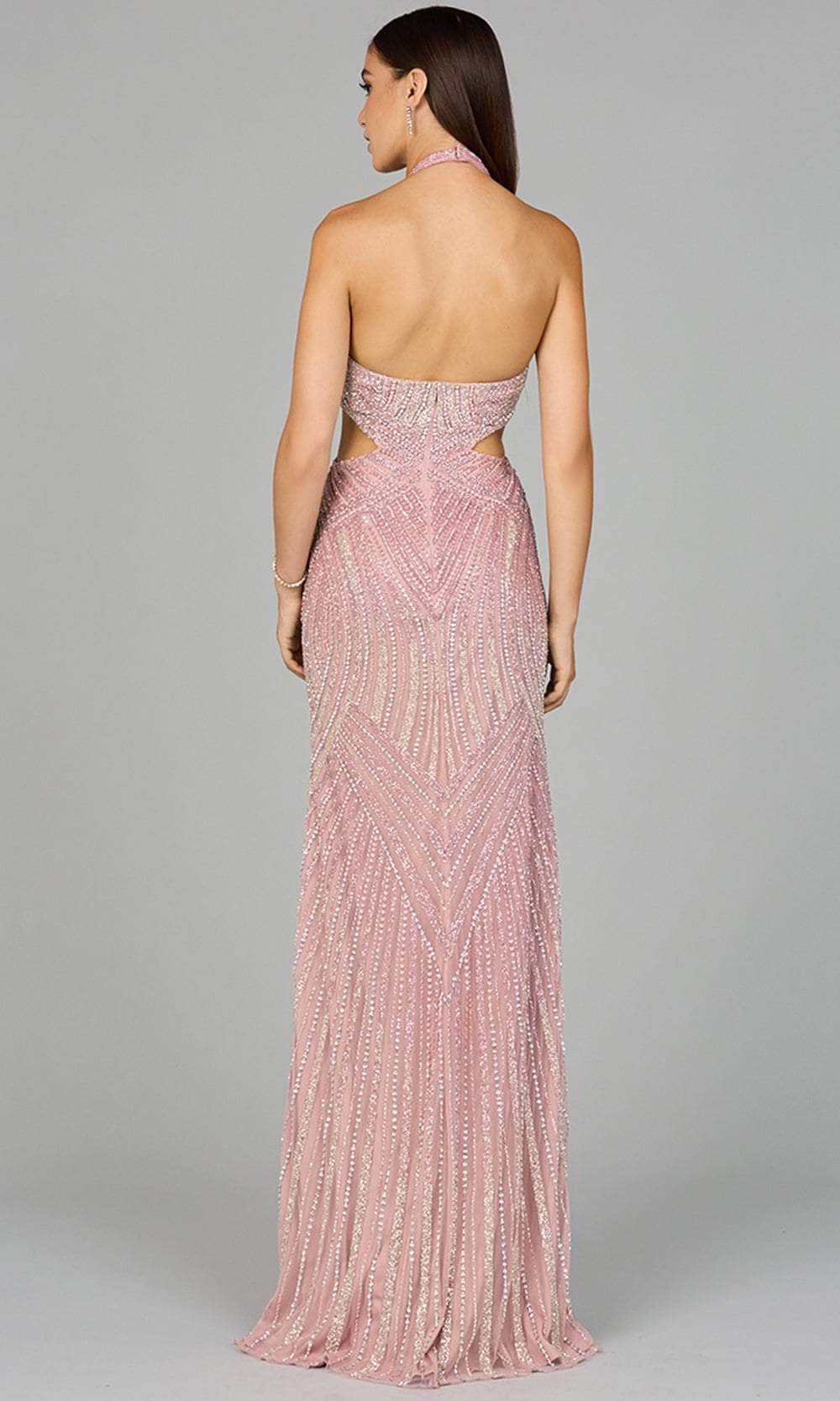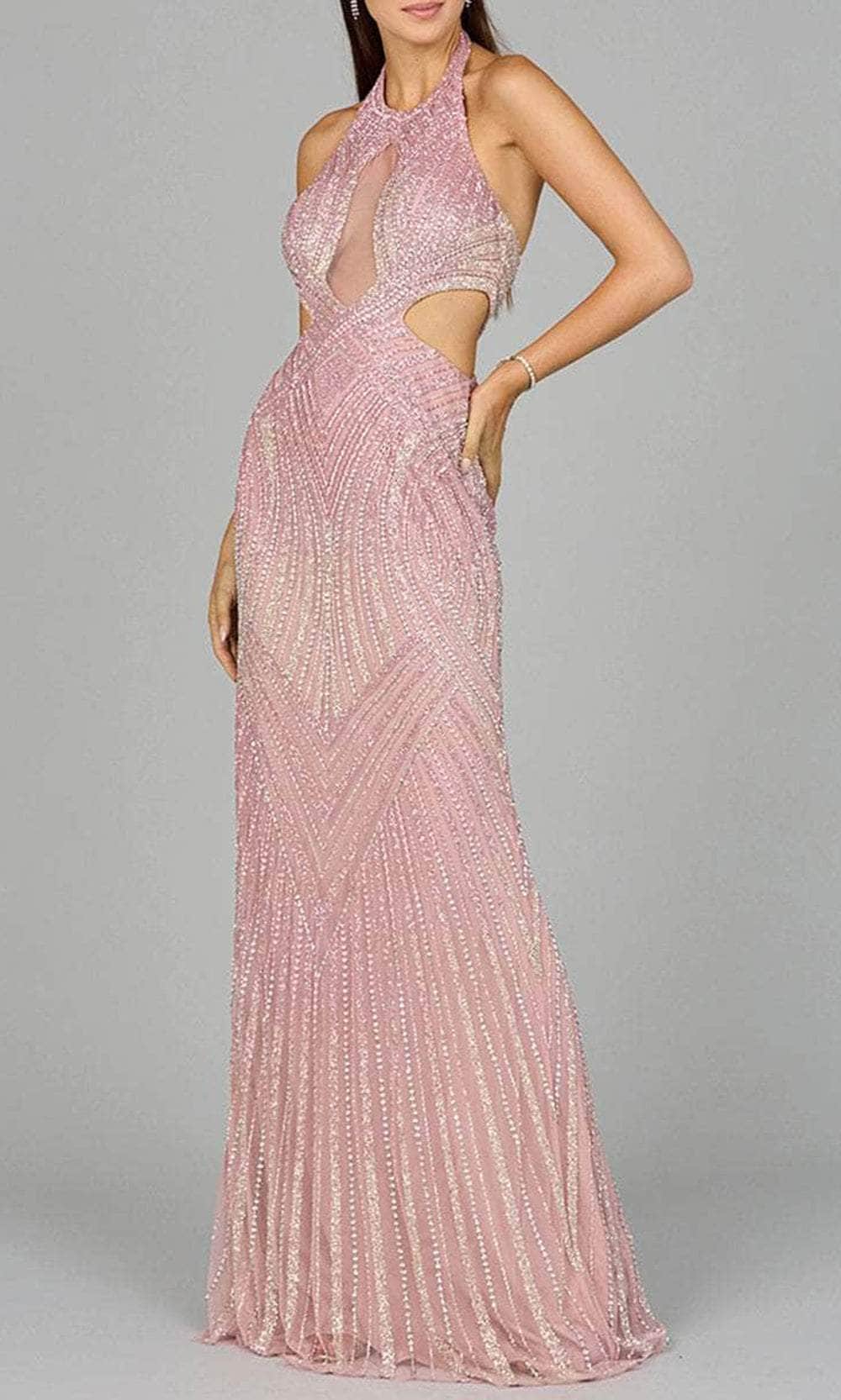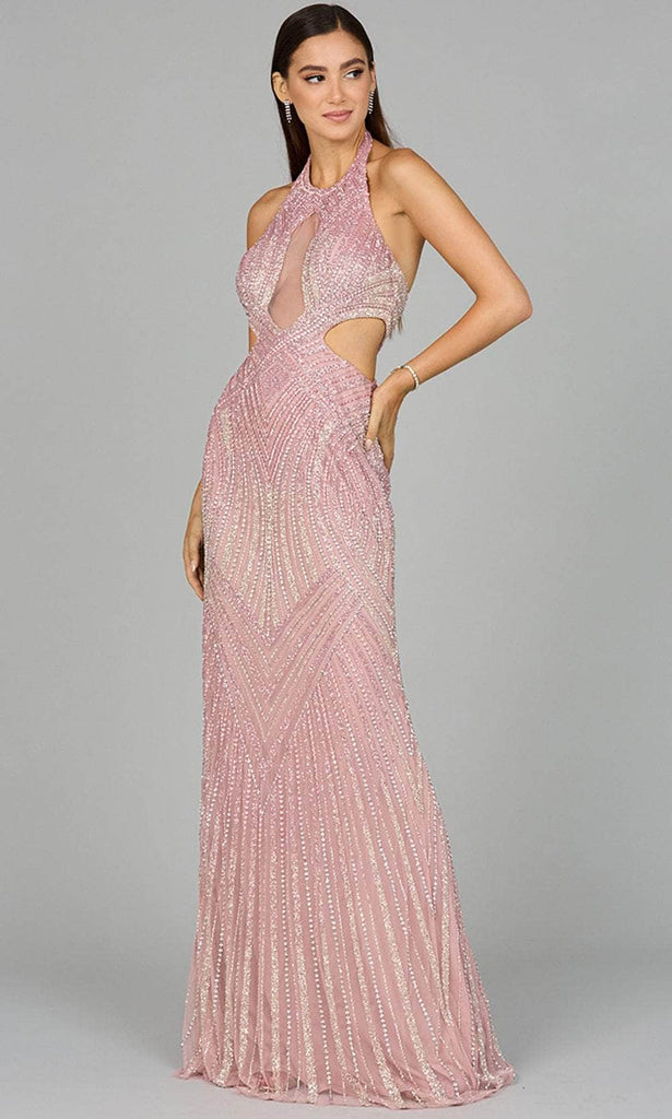 Exude a streamlined yet edgy style with Lara Dresses 9943 a stunning sleeveless prom dress adorned with intricate beadwork. The sleeveless bodice boasts alluring cut-outs at the front and both sides, with a sheer insert accentuating the front opening. Crowned by a chic halter neckline, this dress exudes contemporary charm. The floor-length skirt gracefully flows in a sheath silhouette, completing the ensemble with elegance and sophistication. Lara Dresses 9943 is a perfect choice for those seeking a modern and glamorous look for their special occasion. Model is wearing Cashmere color.
