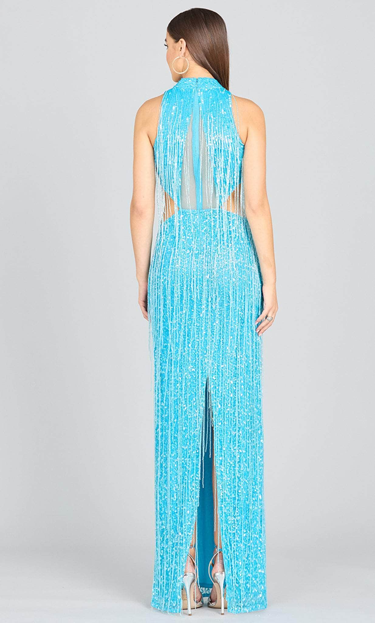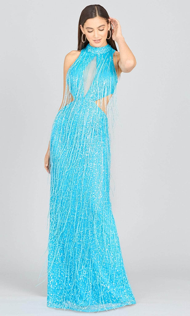 Make everyone swoon at the spectacular elegance of this stylish Lara Dresses 9973 creation. Embellished with shimmering beadwork ornamenting its figure flattering length, this vivid stunner features a high halter neckline on a sleeveless bodice. Accentuated with an illusion cutout bodice, the alluring gown adds drama with its angular side cutouts. Streaming with beaded fringes allover its length, the back is charmed with a semi racer design and a sheer cutout accent. The sheath skirt parts with a back slit as it traverse down to a floor length hemline. Revel in the timeless and alluring element of this exquisite Lara Dresses masterpiece. Model is wearing the Aqua color.