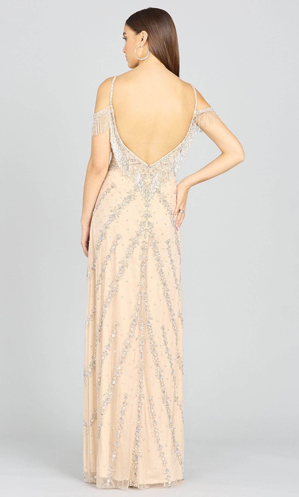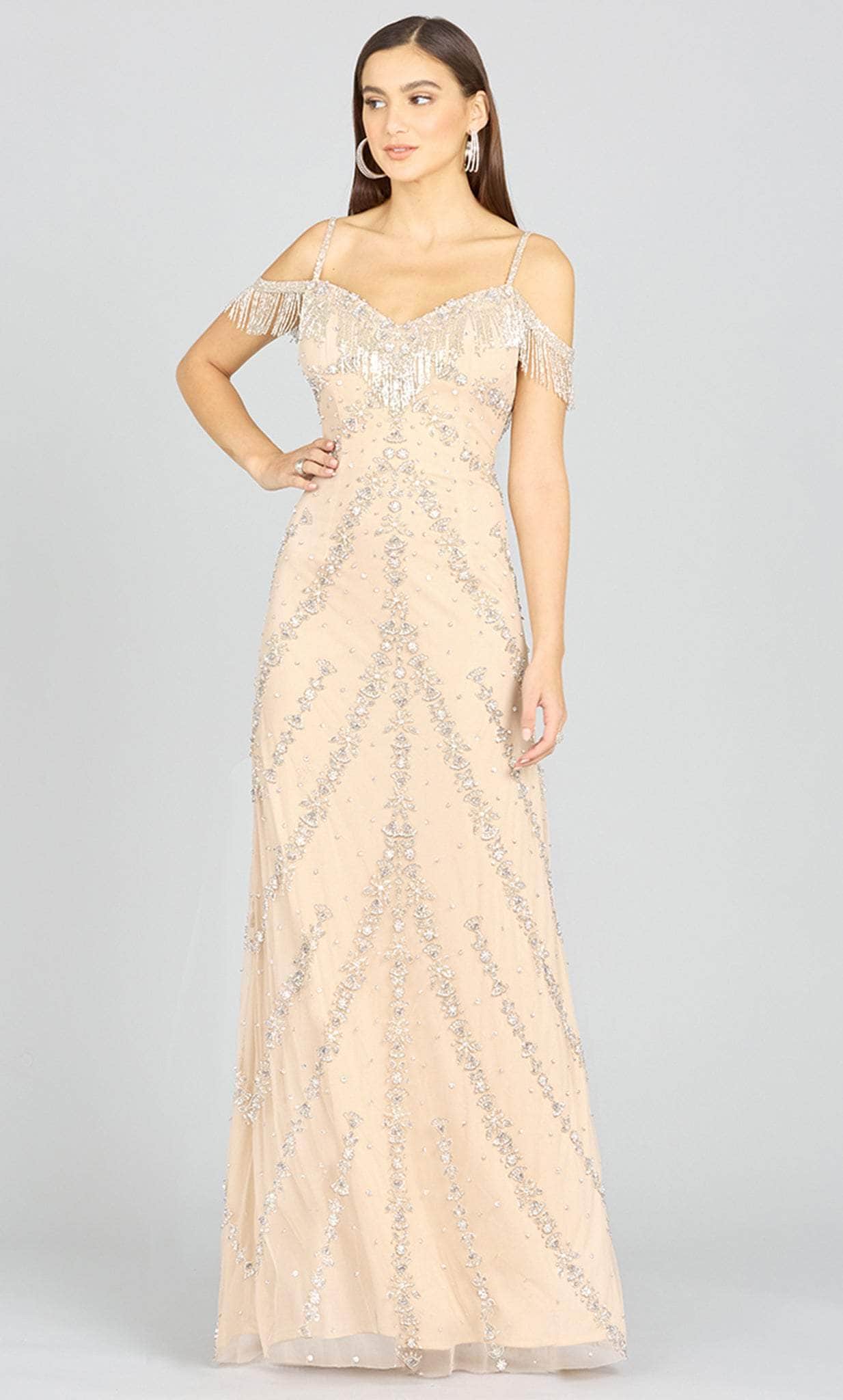 Revel in the timeless and alluring element of this exquisite Lara Dresses 9980 creation. Riddled with embellishments in rhinestones and beadwork shimmering down its length, this gown flourishes a v-neckline with beaded fringes accentuating the draping straps and low v open back. Stringed with spaghetti straps and defined with a cold shoulder style, the sheath skirt sparkles as it flows into a floor length hemline. Make everyone swoon at the spectacular elegance of this stylish Lara Dresses masterpiece. Models are wearing the Nude/Silver and Blue Iris colors.