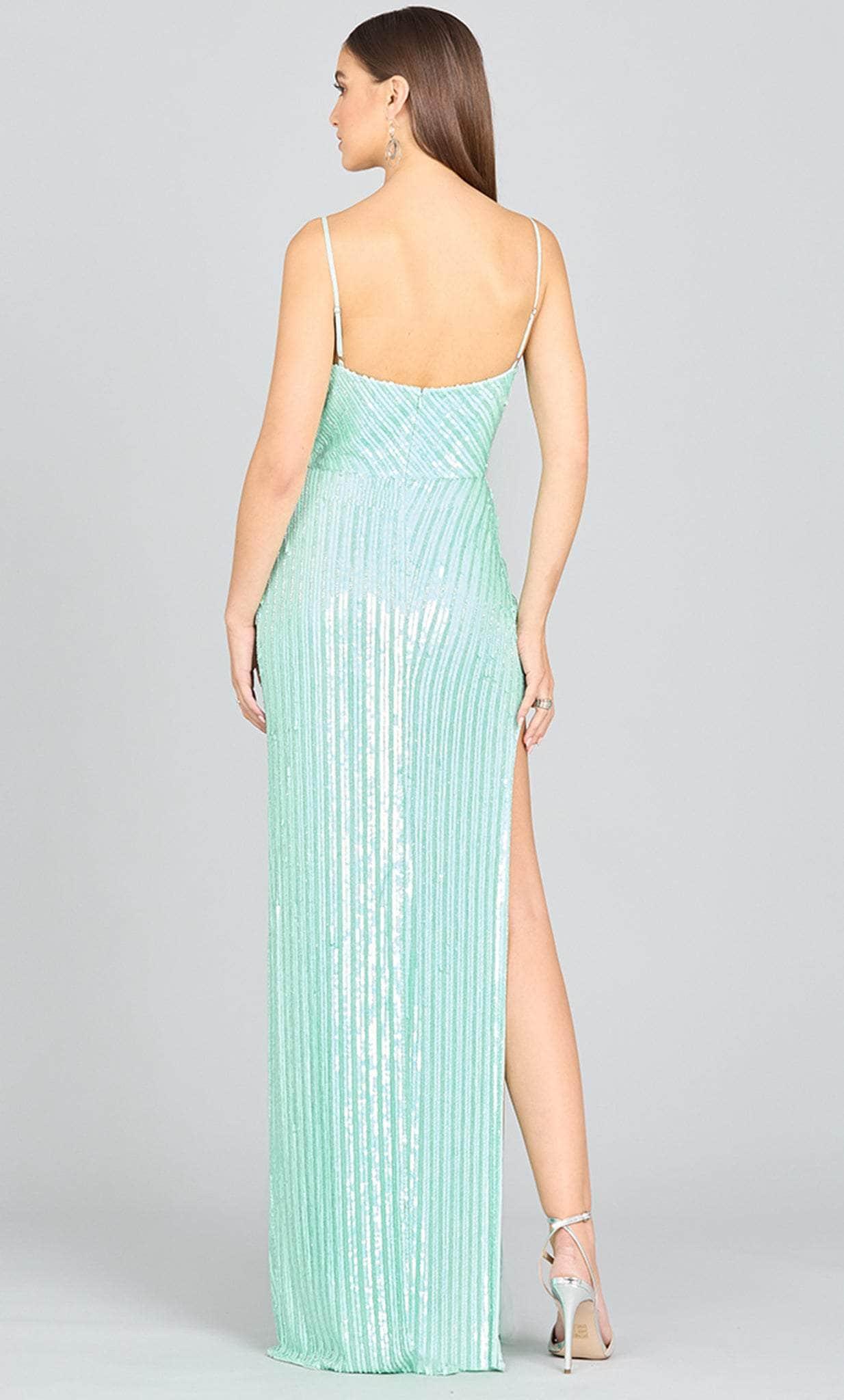 Glisten like the stars on the midnight sky in this mesmerizingly made Lara Dresses 9984 creation. Featuring a cascade of sequins rendered in a stripe like motif, this gown features a soft draped cowl bodice stringed from spaghetti straps. Paired with a midrise back and a zipper closure, the sheath skirt parts with a high slit as it streams into a floor length denouement. Indulge in appreciative glances when you flaunt this Lara Dresses masterpiece. Models are wearing the Blue Iris, Mint and Yellow colors.