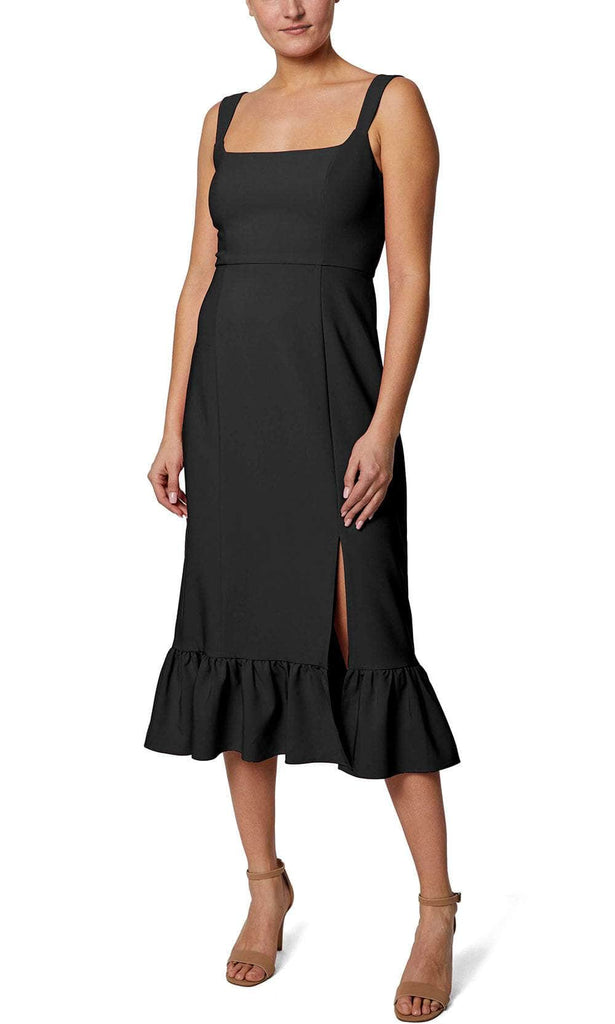Radiate a mesmerizing appeal in this exquisite designed Laundry HU05D09 creation. Stunningly sculpted with tailoring lines on solid scuba silhouette, this dress charms with a square neckline and tank straps. Designed with a midrise back with a concealed zipper closure, the fluttering skirt forms an A-line silhouette as it parts with a high slit and ends with a ruffled tea length hem. Be the center of attention on your next formal occasion in this Laundry masterpiece. Models are wearing the Black and Fuchsia colors.