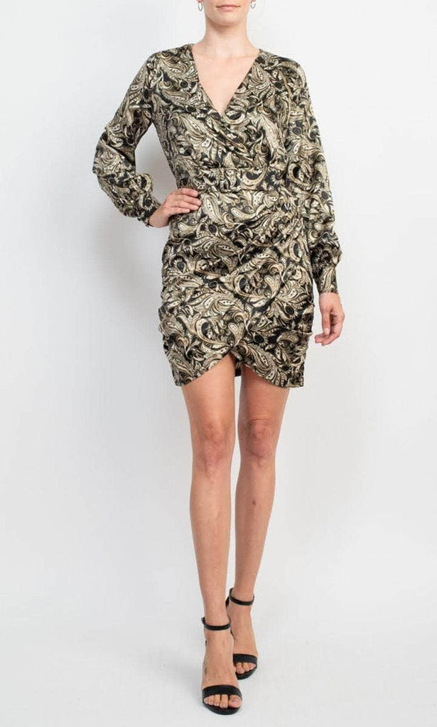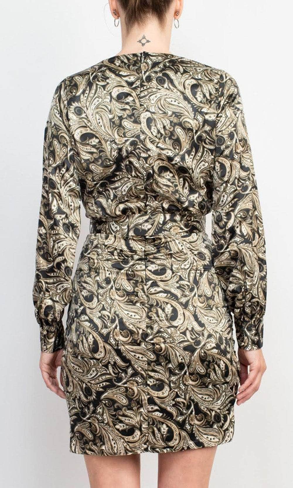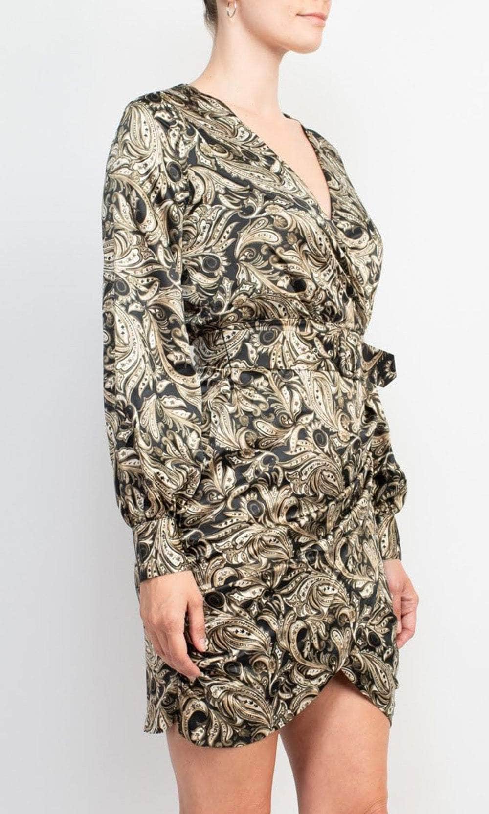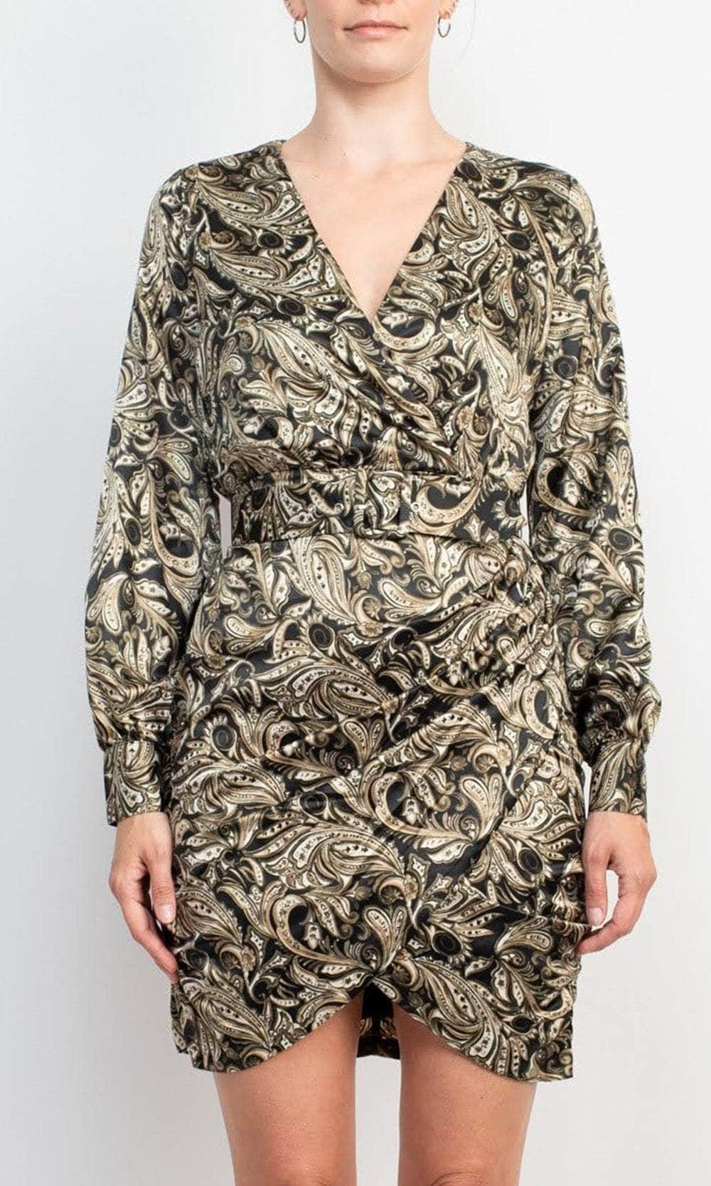 Be swept away by the stylish splendour of this Laundry HU05D26 cocktail dress. The all-over printed design on the satin fabric is intended to make a lasting impression. This outfit boasts a v-neckline, enclosed back and long bishop sleeve with sturdy button cuff. A tonal belt and gathered side further accentuate your figure. The mid-thigh skirt creates a stunning sheath silhouette, which is finished with a flirty tulip hem. This Laundry HU05D26 creation will absolutely make you feel special! Model is wearing the Black Multi color.