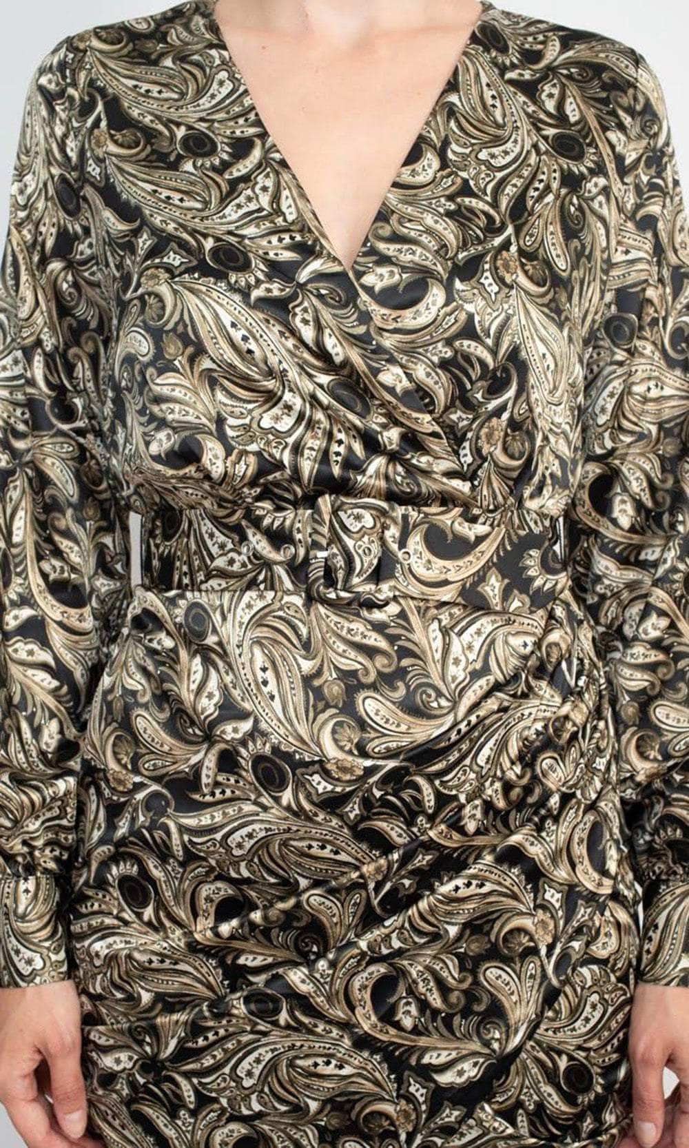 | Details: | Long Bishop Sleeve, Button Cuff, Printed, Gathered Side, Belted, Full Back, Back Zipper, Tulip Hem |