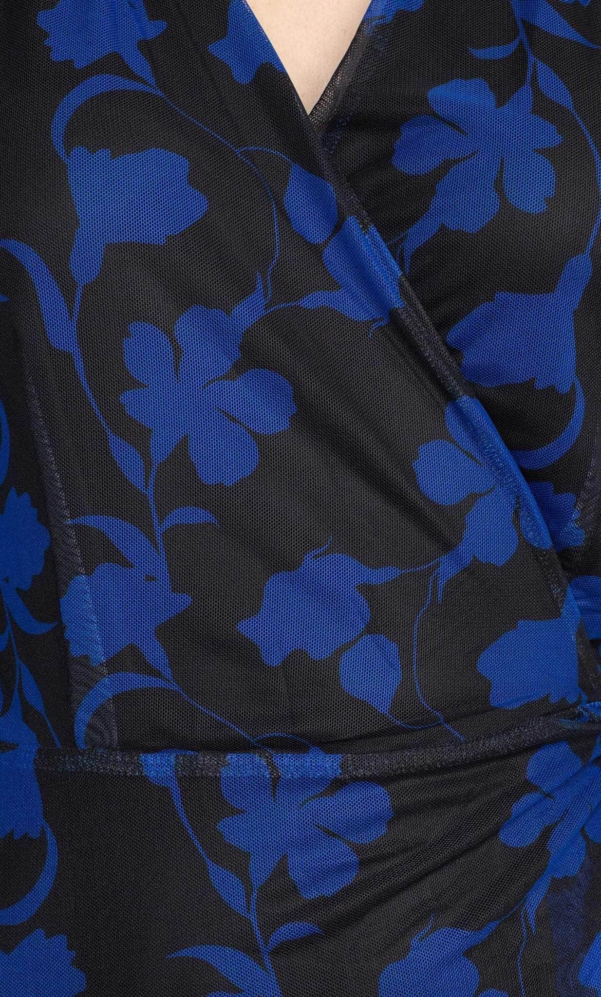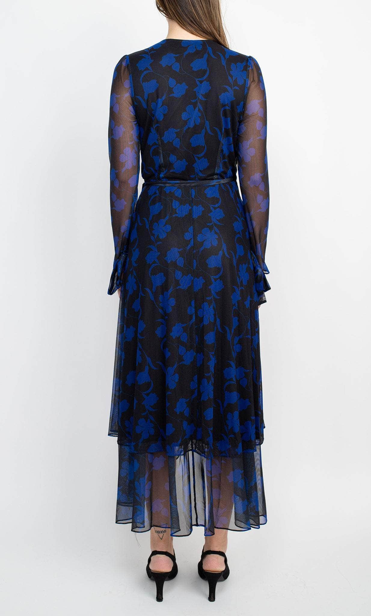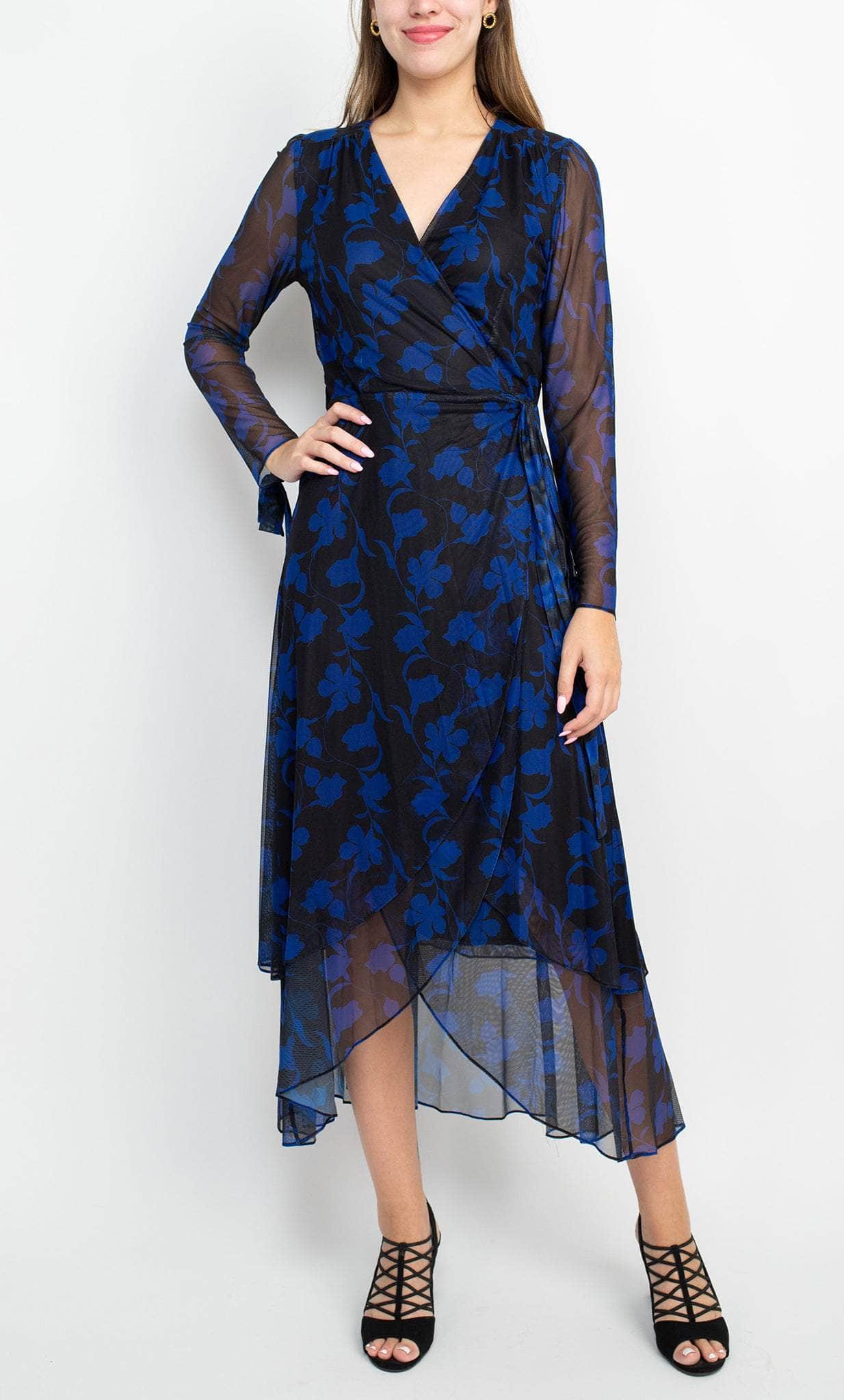 Be destined to shine in this exquisitely designed Laundry HU05D34 creation. Flaunting a lined bodice and styled with a floral contrast overlay, this dress features a v-neckline with a wrap bodice and a strap that ties at one side of the waist. Framed with sheer long sleeves and a full back. The skirt flaunts a wrap style with a sheer high low hemline. Achieve the next level of elegance in this Laundry masterpiece. Model is wearing the Black Azure color.