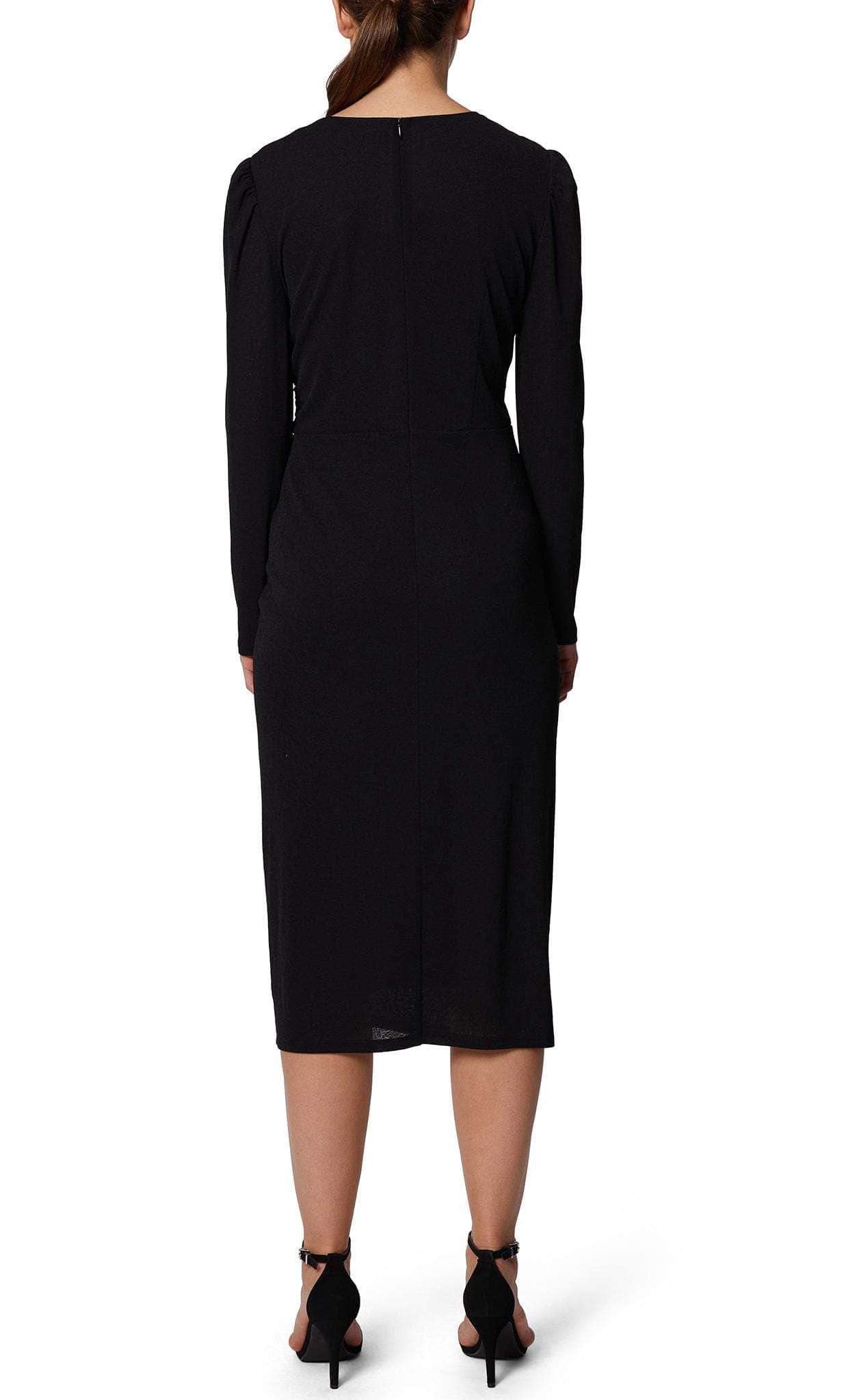 Don a style that will always be timeless in this chic Laundry HU07D04 creation. Designed with tailoring lines and detailed with soft draping on the figure flattering bodice, this dress features a jewel neckline with a pair of long sleeves. Designed with a full back and a concealed zipper closure, the drape rendered skirt opens with a high slit for leg exposure as it forms a sheath silhouette with a tea length hem. Be inspired to shine at your finest in this gorgeously detailed Laundry masterpiece. Model is wearing the Black color.