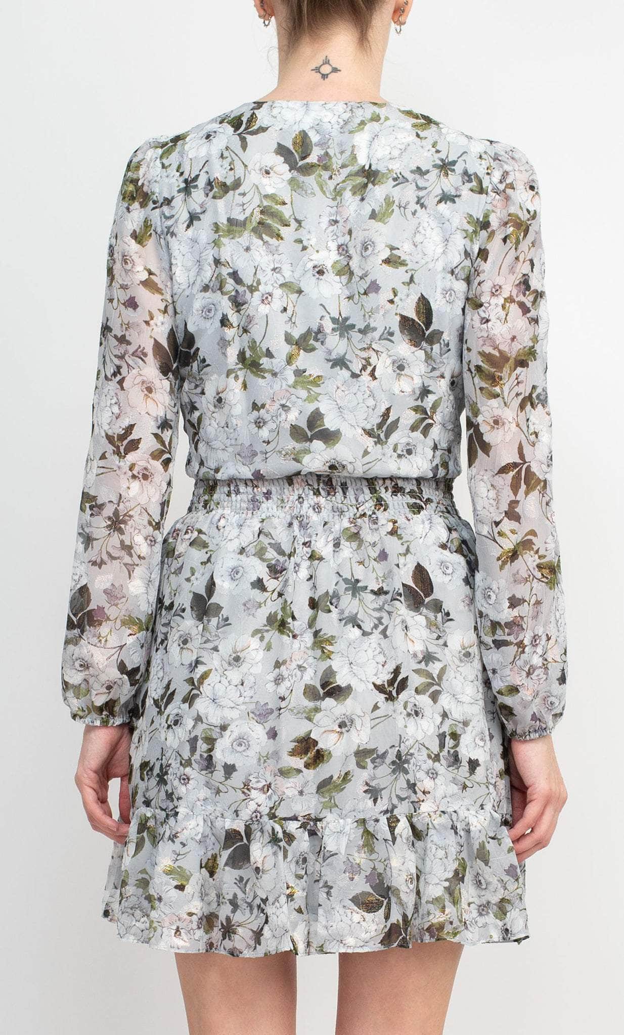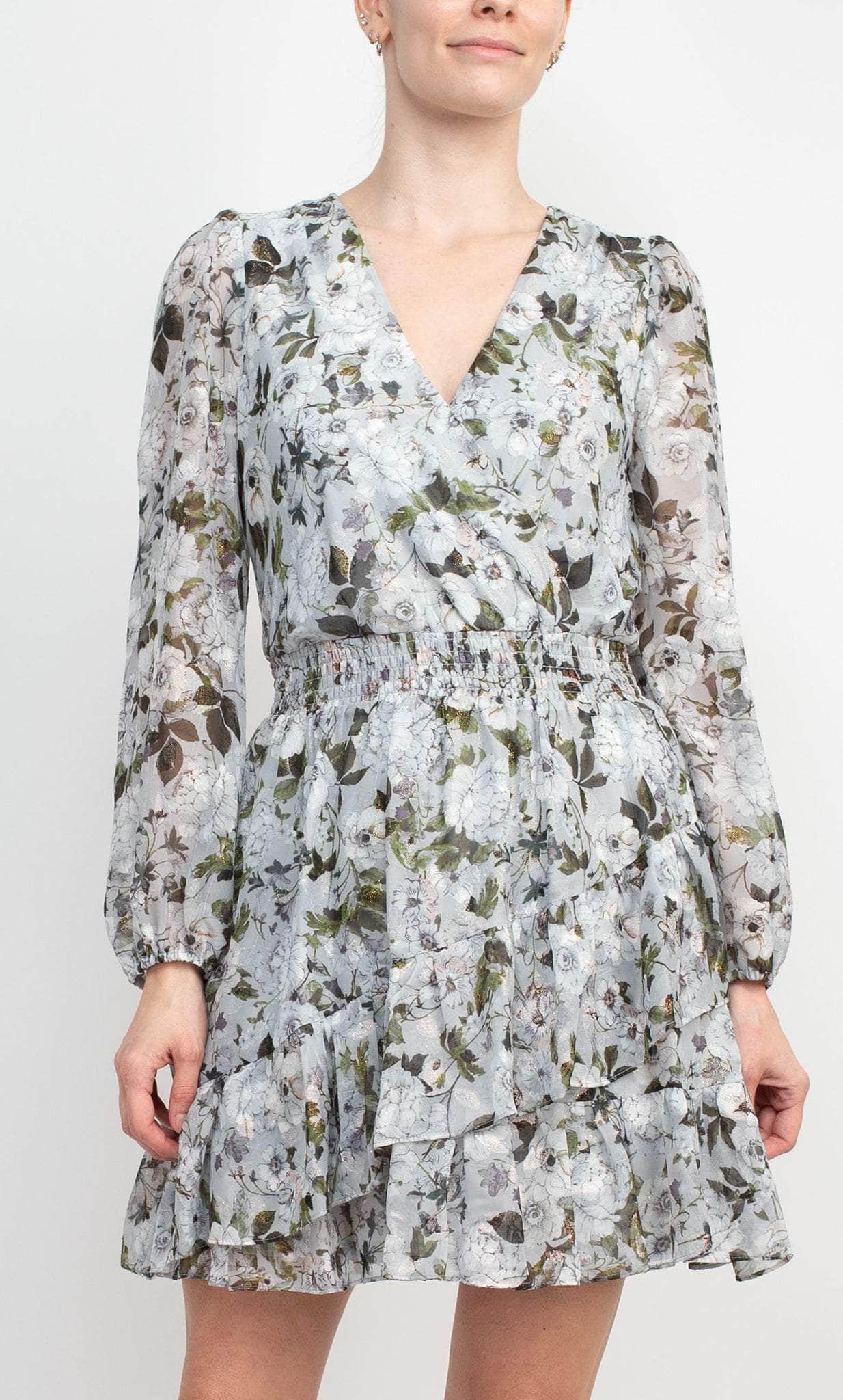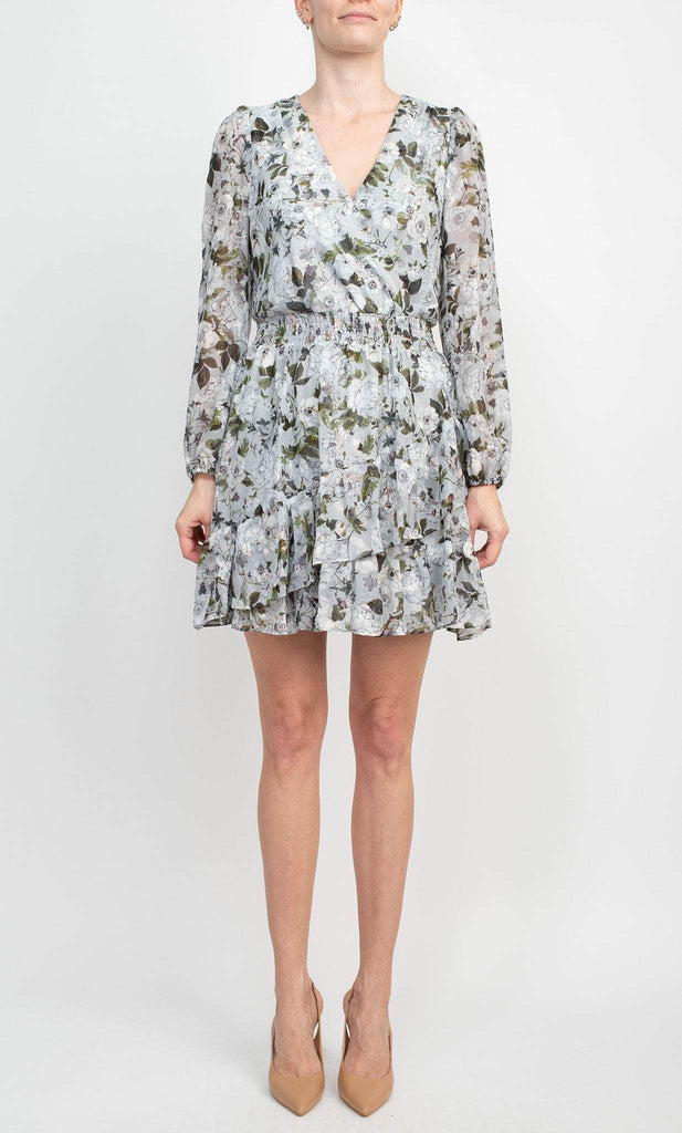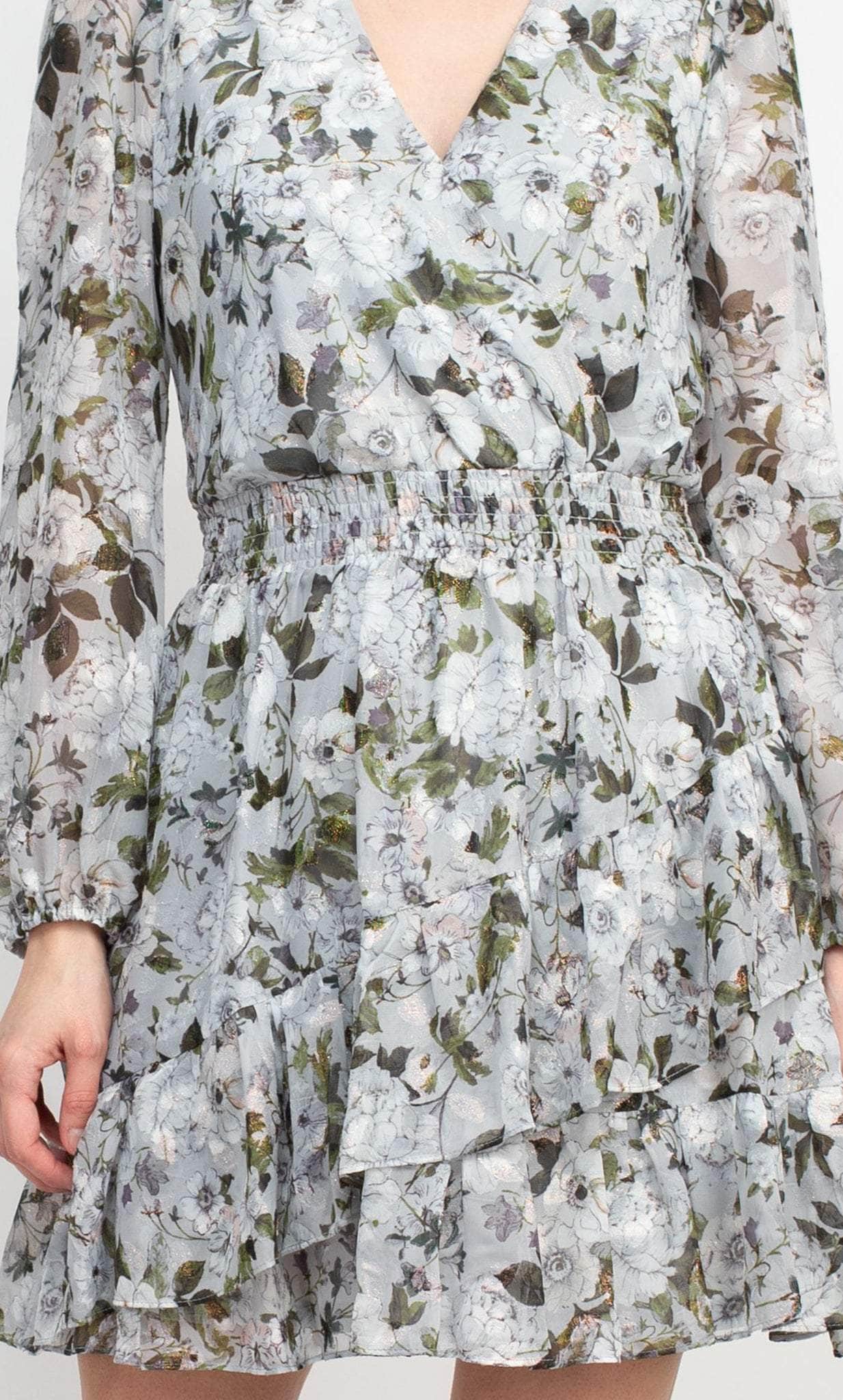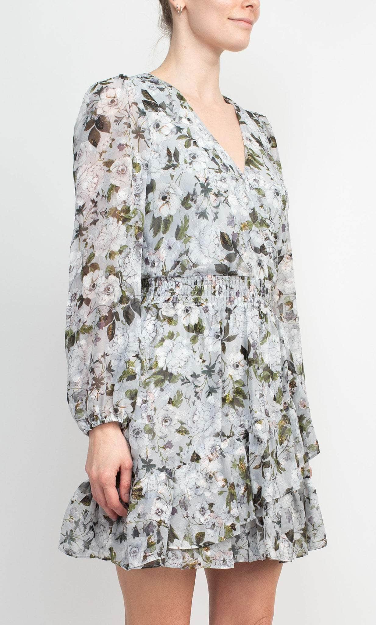 Be the breath of fresh air to covet in this stunningly made Laundry HU07D29 creation. Beautifully designed with a tailored lining and overlaid with sheer floral print chiffon, this beauty charms with a v-neckline and styled with a surplice bodice. Flaunting sheer bishop sleeves, a full back and nipped with a garterized band along the waist, the tier ornate skirt flutters into an A-line silhouette with a mini hemline. Make a lasting impression from every angle in this stylishly made Laundry masterpiece. Model is wearing the Full Bloom color.
