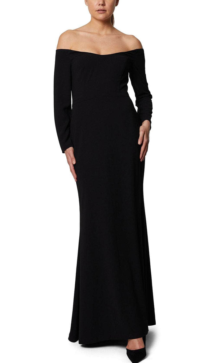 Embrace a classic sense of style in this engaging gown by Laundry HU07D51. This timeless elegant gown is perfectly tailored to flatter your figure. It presents an alluring off-shoulder straight across neckline and long sleeves, while the mid-open back is cinched by a center zipper. The skirt gently flows to the full length hem and highlights a mermaid silhouette. This Laundry HU07D51 style is a sure standout on your next evening social event. Model is wearing the Black color.