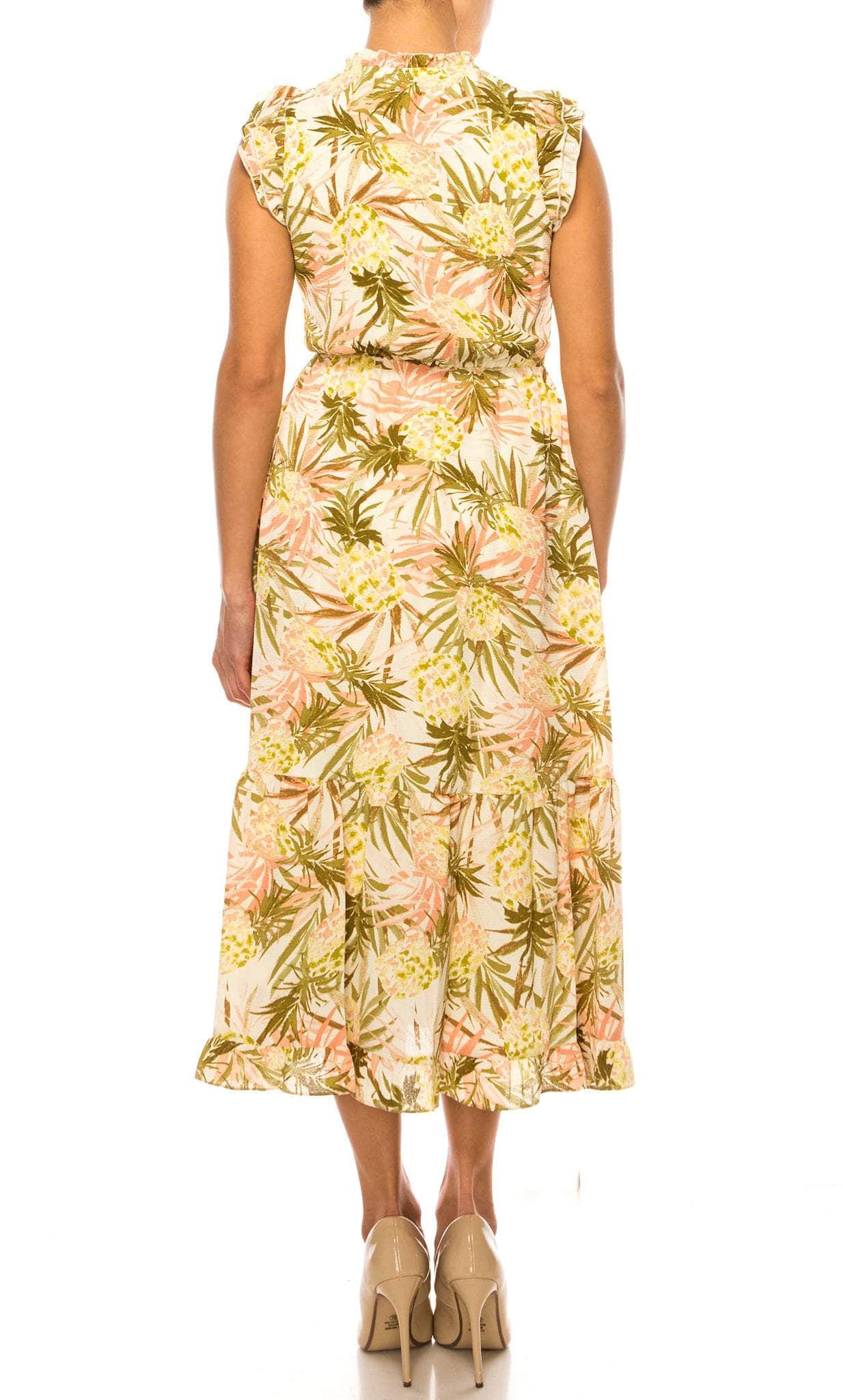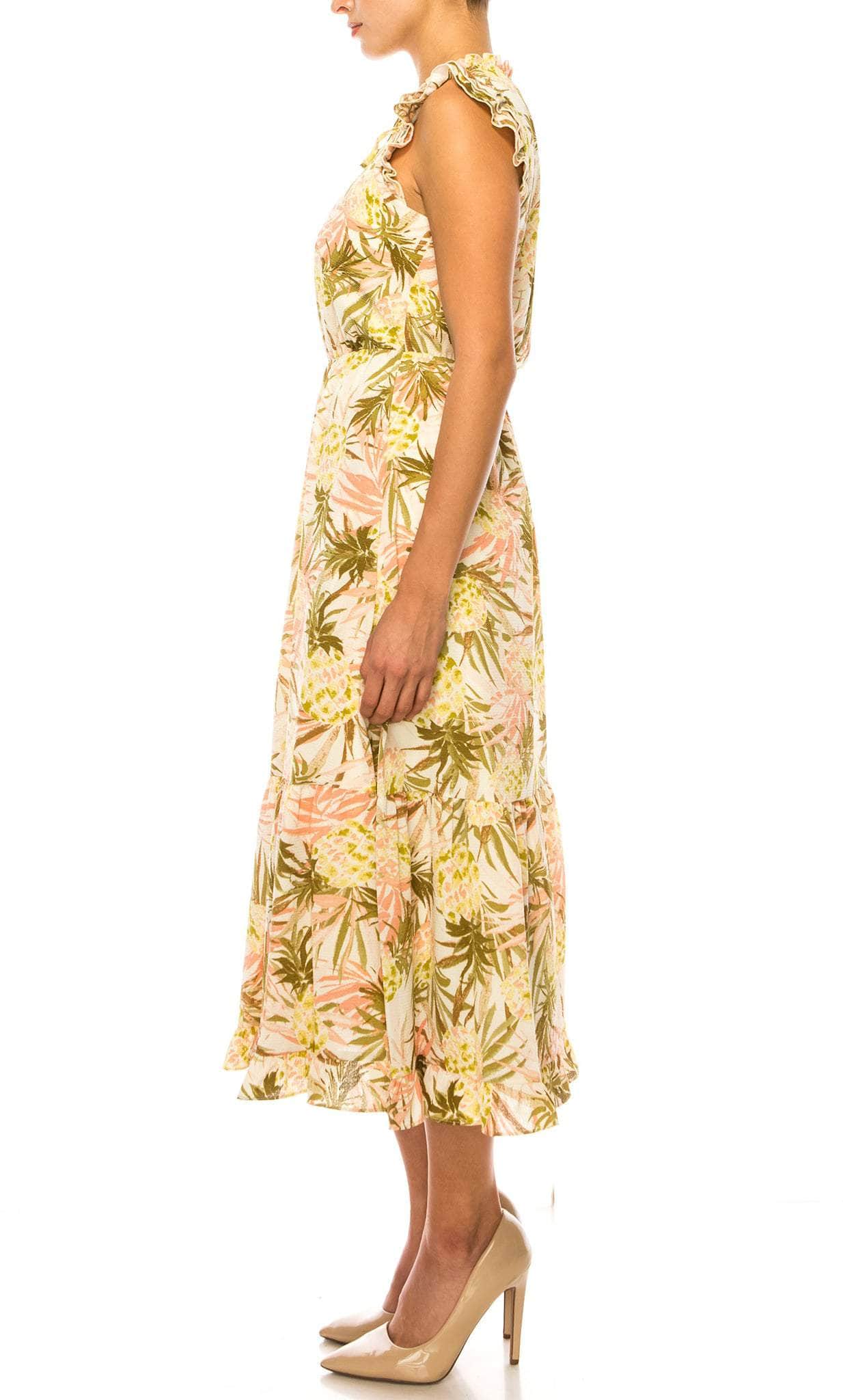 Be a delight to everyone's eyes from giving off a stunning freshness upon wearing this Laundry HV03D25. Refreshingly vibrant as seen from its pineapple print-outs, this tea-length dress is really perfect for that summer getaway for it features keyhole neckline, topped with a spaghetti tie, and a ruffled pair of cap sleeves. Sewn with a normal waistline, it brings about a column-silhouette skirt with tiered ruffles down the hemline and a darted contsruction to flatter your figure. Go with this fun, gorgeous, and youthful Laundry HV03D25 masterpiece! Model is wearing Anana Tropical color.