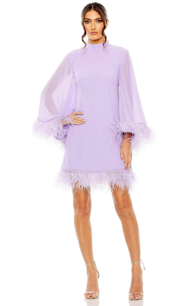Wear this Leena Duggal 11439 cocktail dress to embrace classic elegance. This exquisite creation is crafted from flowing chiffon fabric, embracing your figure in a sheath silhouette. The high neckline exudes elegance, while the cape sleeves add a touch of drama. Delicate feather trim along the cuff and hem bring a whimsical and unique detail. The back zipper closure ensures a seamless fit. Captivate with every step in this stunning Ieena Duggal 11439 that embodies grace and sophistication. Model is wearing Lilac color.