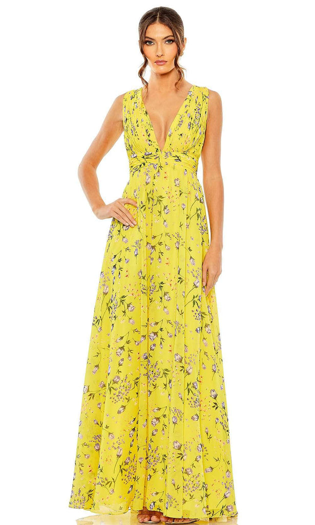 Command attention in the Ieena Duggal 56011 dress, an exquisite ensemble that exudes confidence and allure. The sleeveless bodice features a plunging V-neckline, creating a captivating focal point. Delicate ruched details add a touch of texture and sophistication. The dress is adorned with enchanting floral prints, adding a whimsical and romantic charm. A V-shaped back adds an element of elegance, while the long A-line skirt flows gracefully with every step. Complete with a convenient back zipper closure. This Leena Duggal 5601 is a true showstopper, combining timeless beauty with a modern flair. Model is wearing Yellow Multi color.