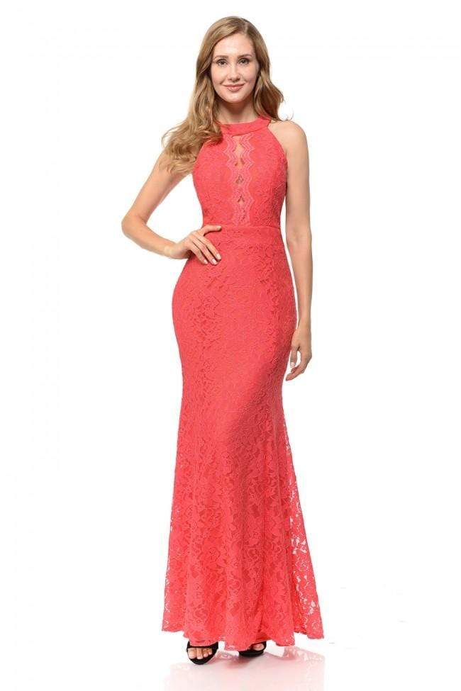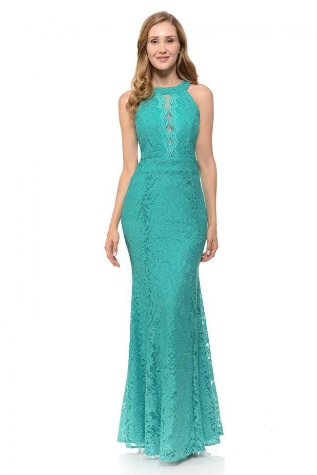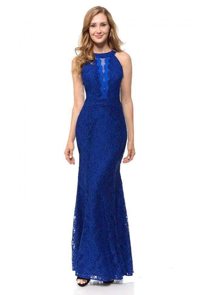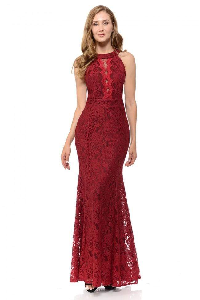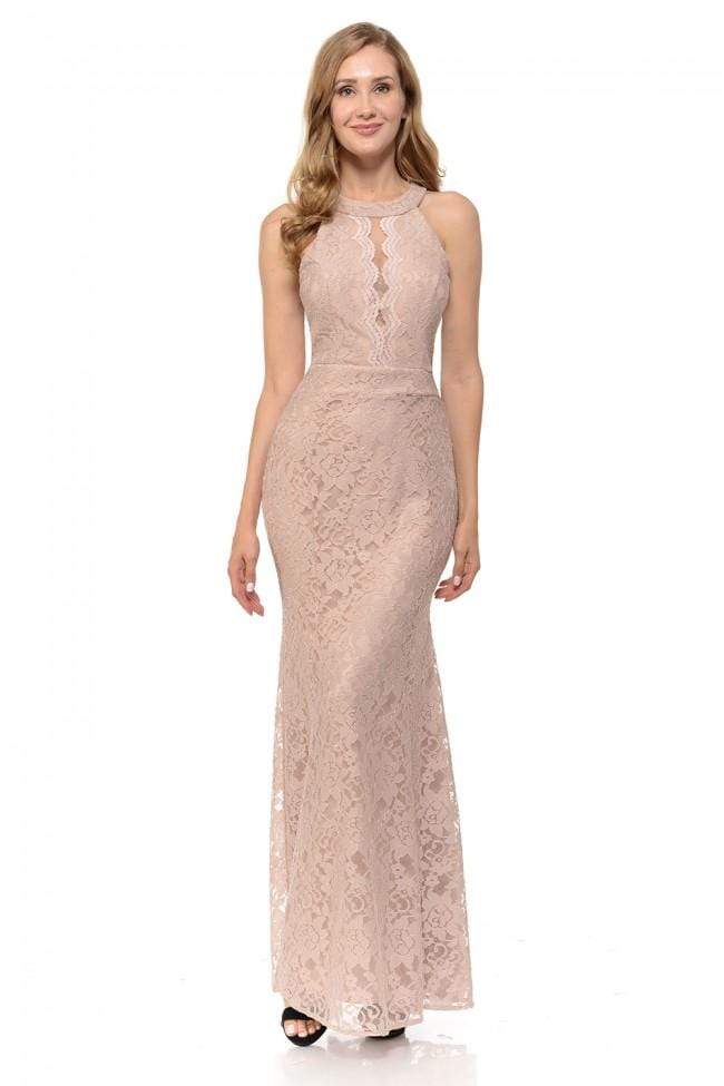 Get on the best-dressed lists in this lavish dress from Lenovia 5189. This lace dress appeals in a sleeveless, halter neckline with sheer inset and scalloped details. The skirt flatters your figure with a fit and flare silhouette and runs in full length hem. Traditional style gets a glam twist in a sophisticated dress from Lenovia.