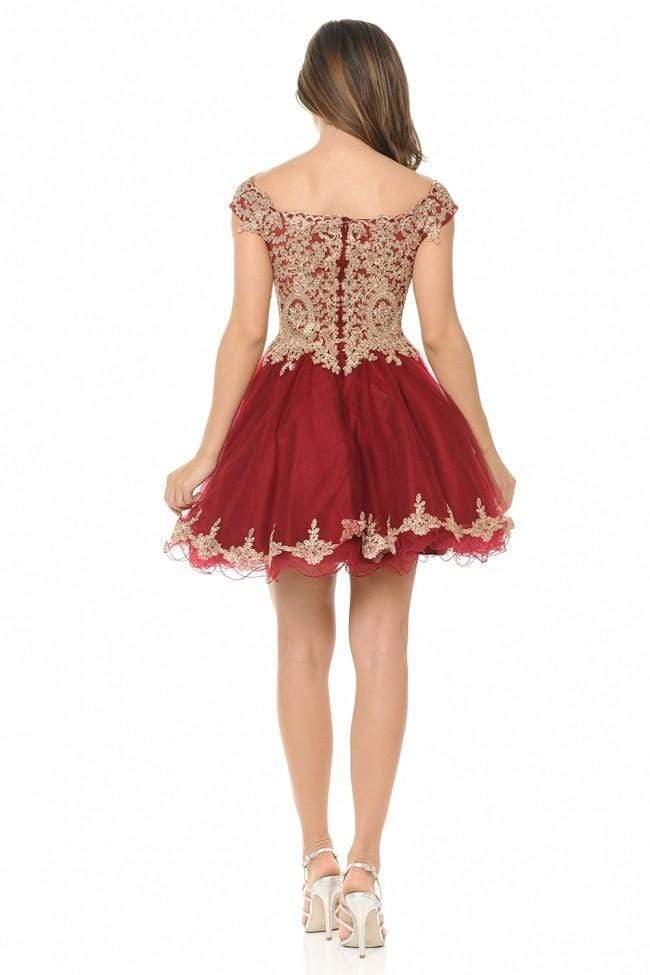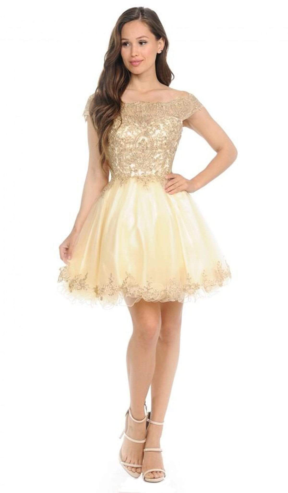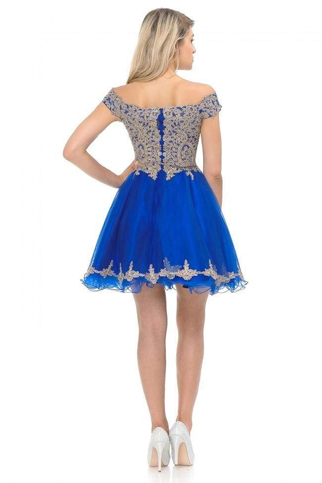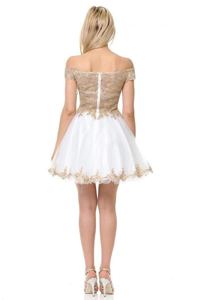 Make a spectacle of feminine flair in this sophisticatedly crafted Lenovia 8124 creation. Designed with a sheer mesh defined with gold embroidered appliques and iridescent stones, this lovely stunner shows an off shoulder neckline paired with a mid-open back. Defined with a sweetheart bust and trailing fringes, the A-line skirt flares with a gilded lace border and a short rolled hem. Engage in an enchanting night with style in this tantalizing Lenovia masterpiece.