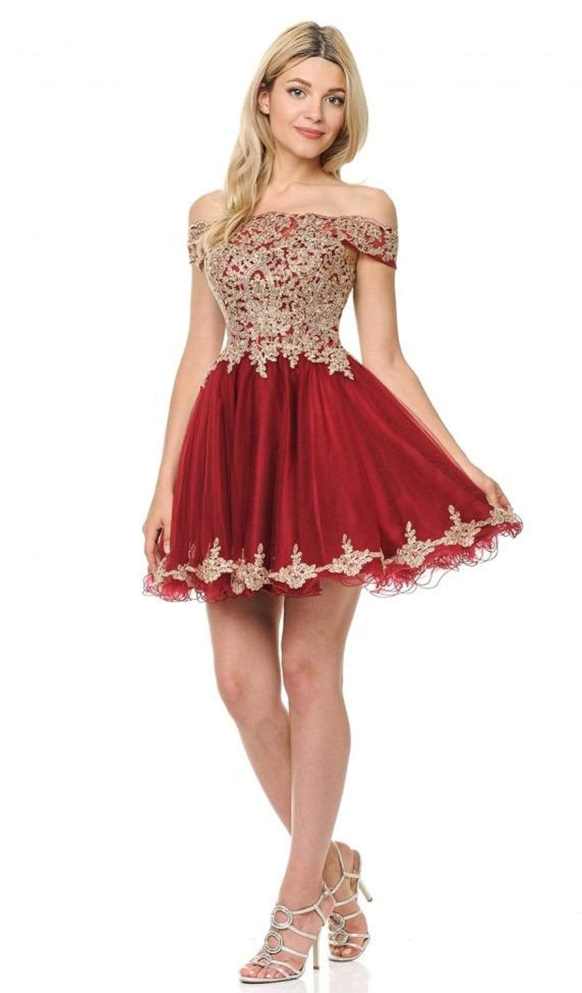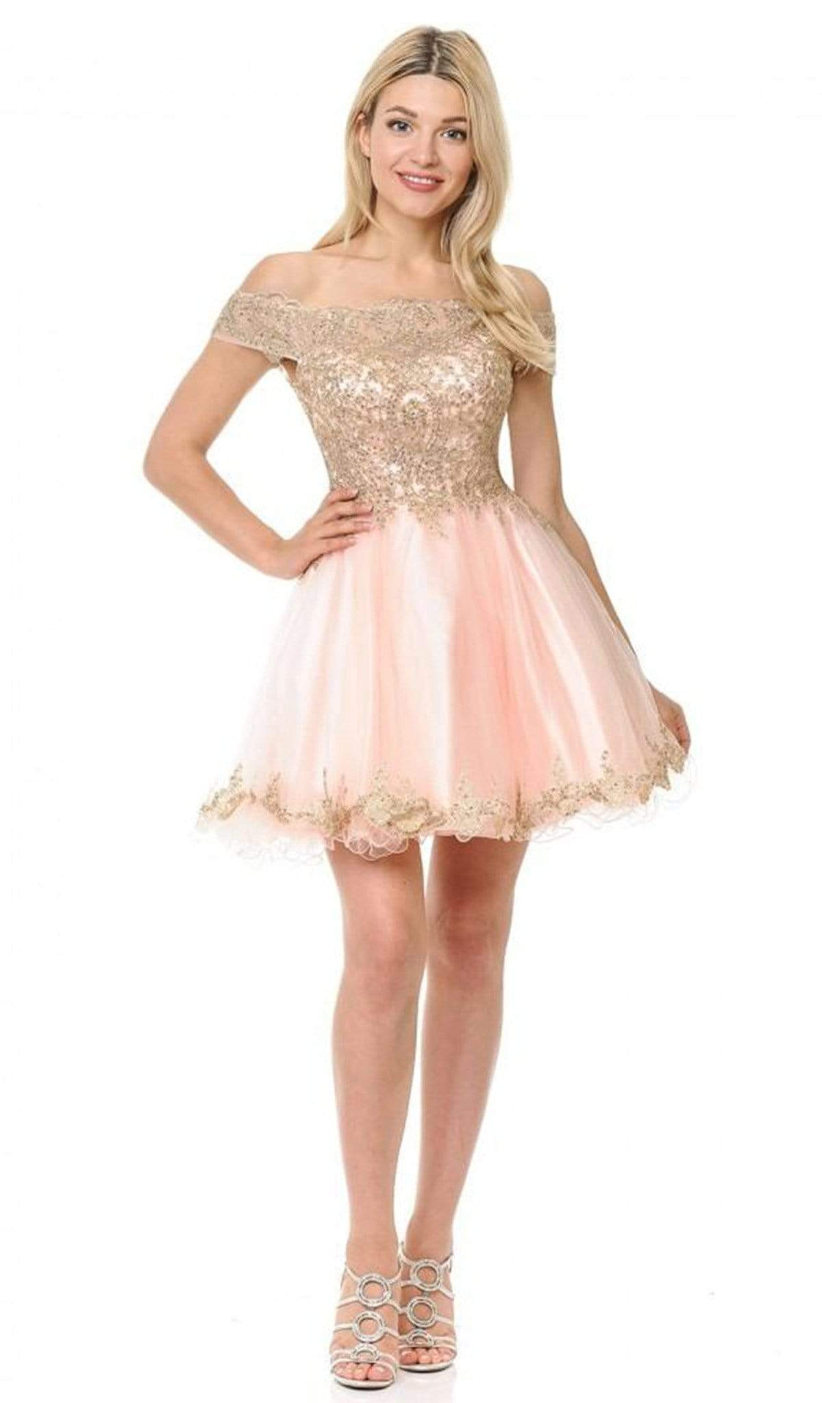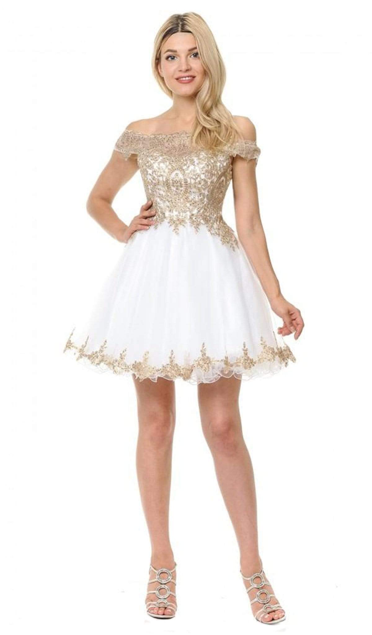 Make a spectacle of feminine flair in this sophisticatedly crafted Lenovia 8124 creation. Designed with a sheer mesh defined with gold embroidered appliques and iridescent stones, this lovely stunner shows an off shoulder neckline paired with a mid-open back. Defined with a sweetheart bust and trailing fringes, the A-line skirt flares with a gilded lace border and a short rolled hem. Engage in an enchanting night with style in this tantalizing Lenovia masterpiece.