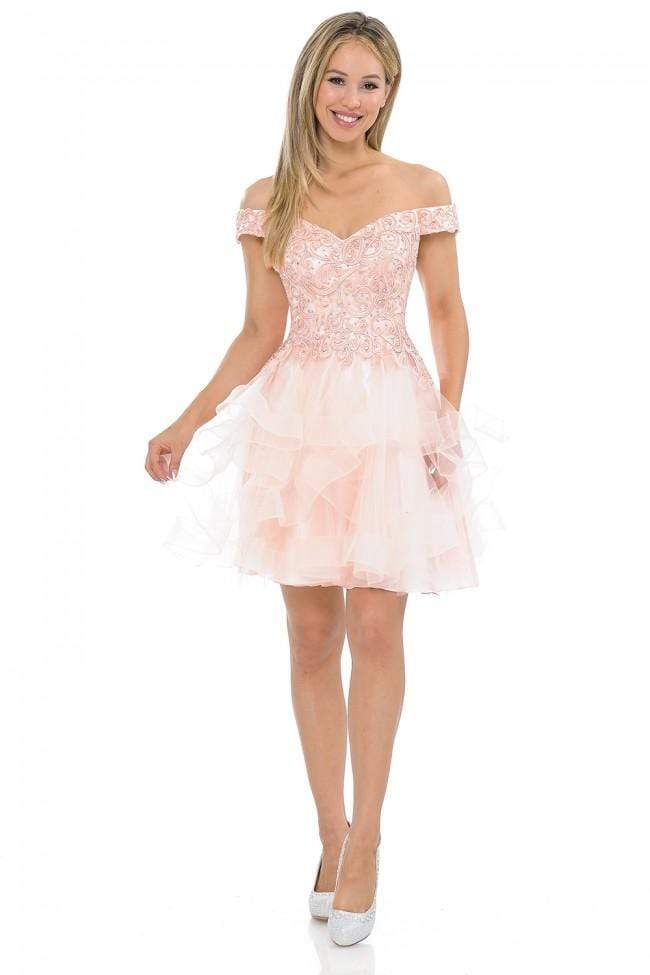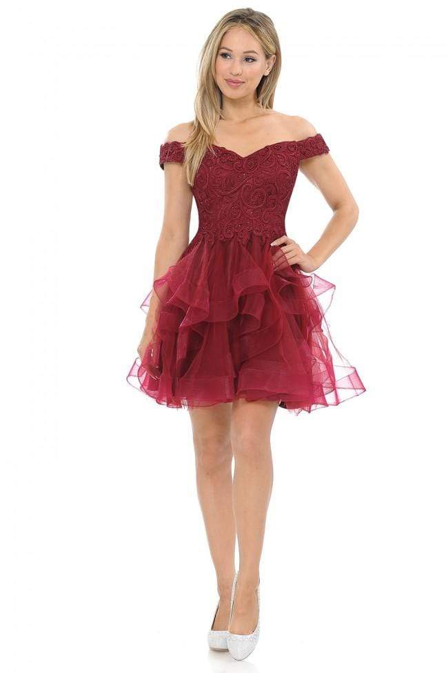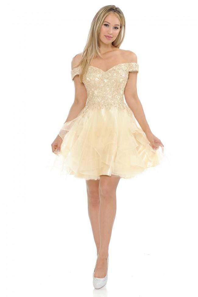 Fill the room with warmth and light in this radiant dress by Lenovia 8130. This embroidered cocktail dress features an off the shoulder neckline. The layered skirt opens in a mid-thigh A-line silhouette with a horsehair hemline. Dress to the nines in this glam look by Lenovia.