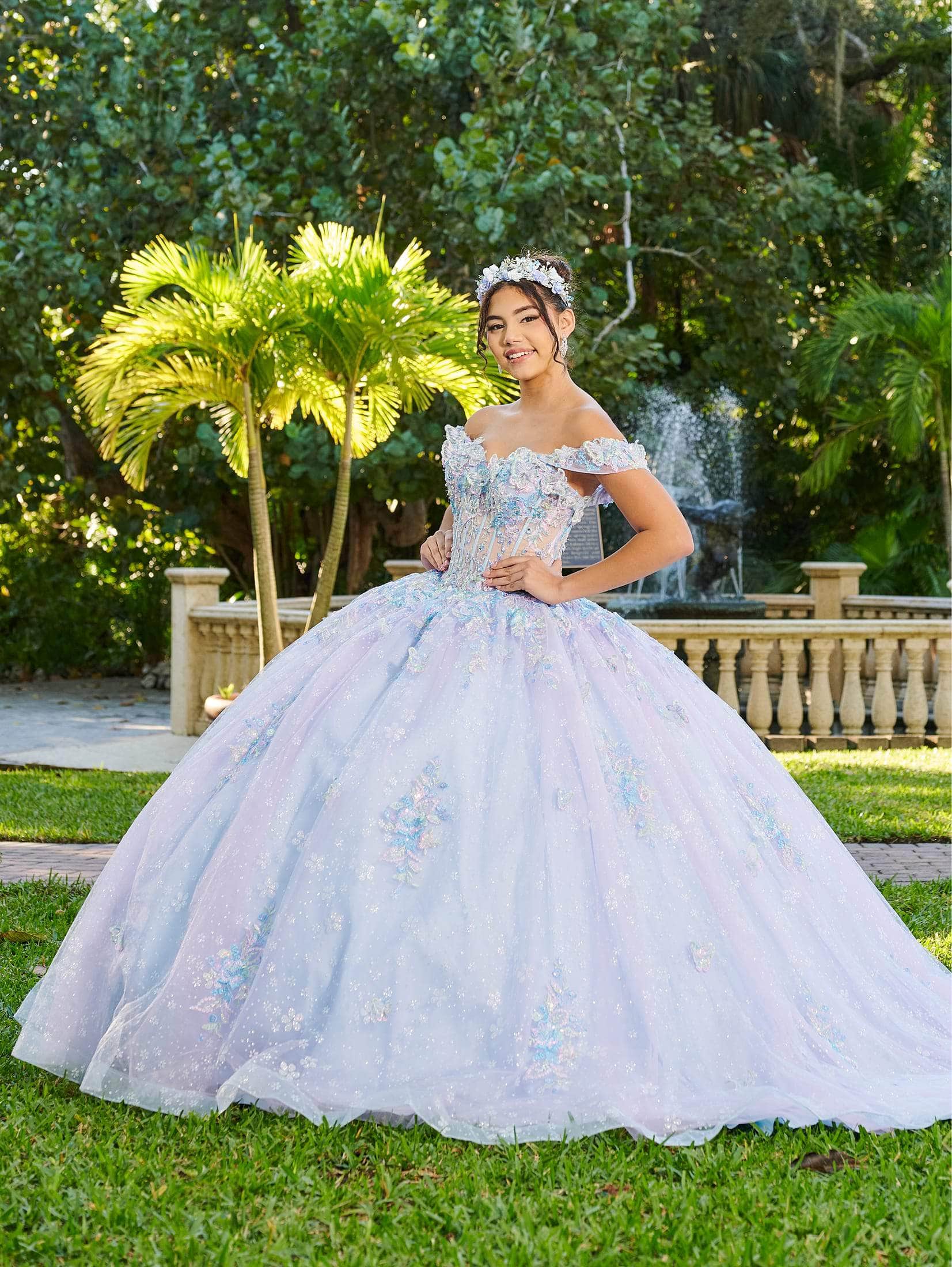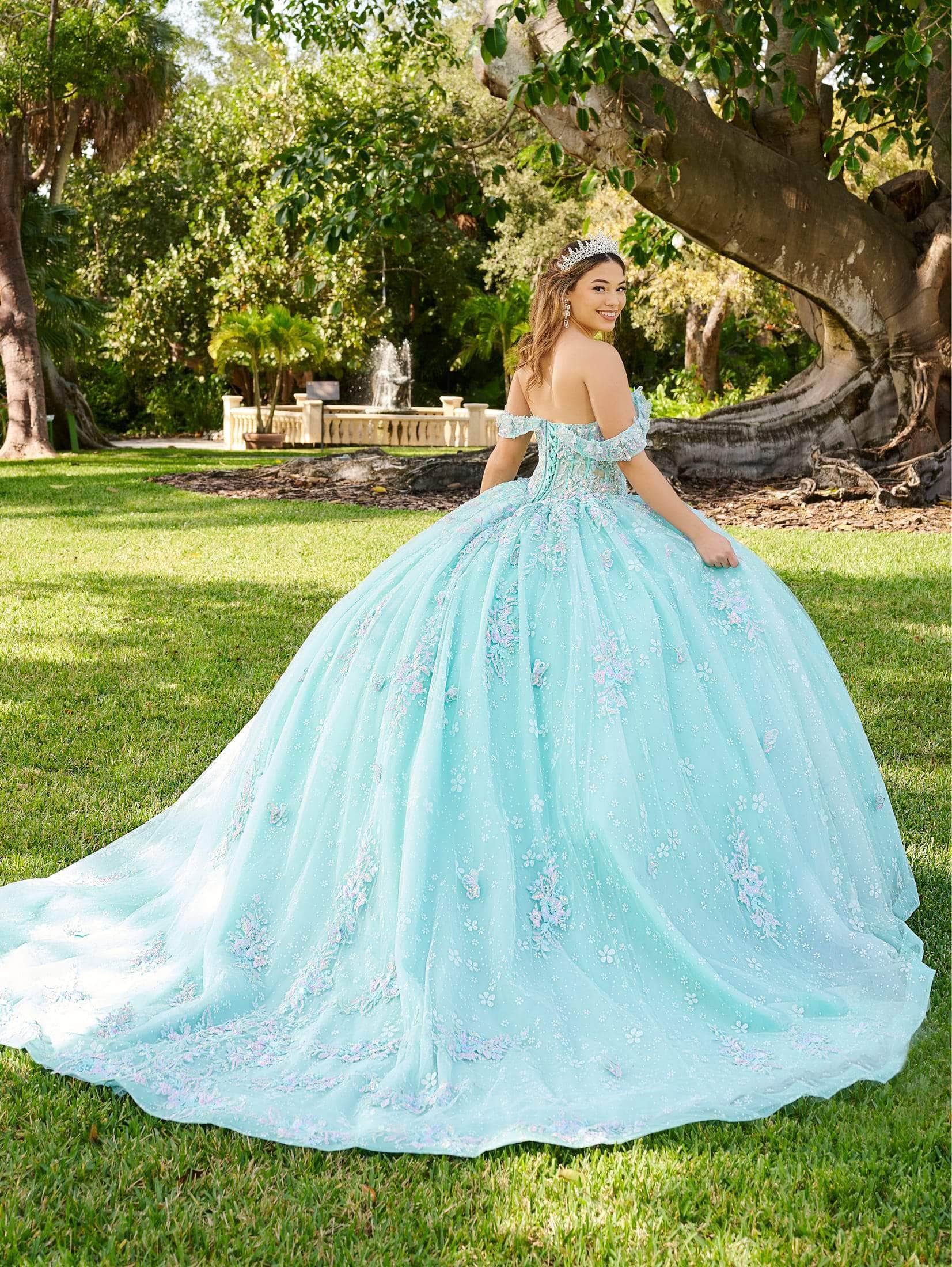 Step into your fairy tale with Lizluo Fiesta 56515, a Quinceañera gown that embodies the essence of a garden fantasy. The sweetheart bodice is adorned with pastel-colored three-dimensional floral appliqués, cascading down the glitter tulle skirt in a whimsical display. Delicate straps gracefully drape around the shoulders, adding to the enchanting allure. Complete with a lace-up tie at the back for a perfect fit, this Lizluo Fiesta 56515 culminates with a majestic train, ensuring you make a grand entrance. Models are wearing Aqua Sky Multi and Blue Lilac Multi colors.