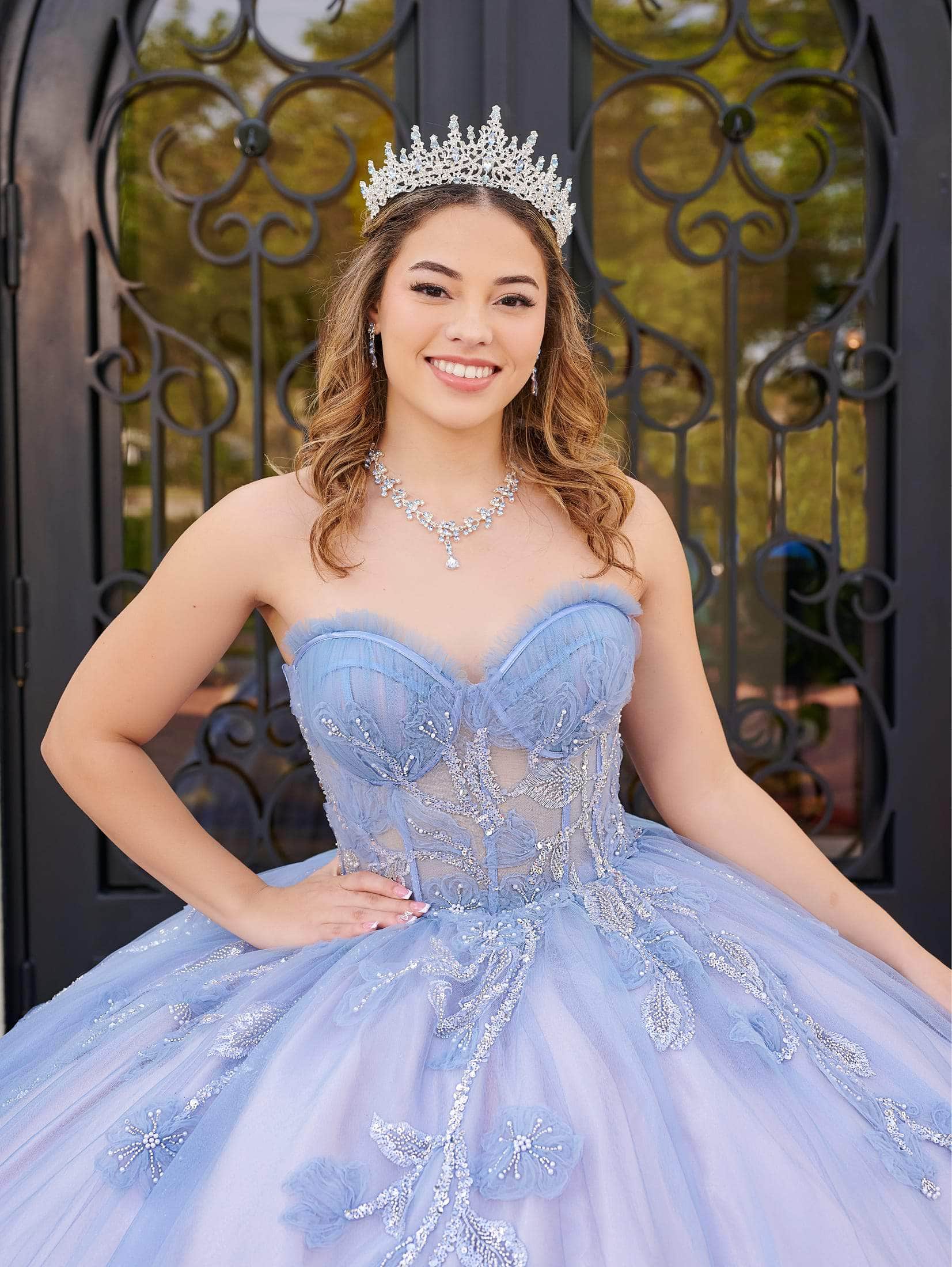 A timeless and enchanting presence is assured with Lizluo Fiesta 56521, a breathtaking Quinceañera ball gown. The corseted bodice features hand-draped tulle on the cups, while delicate ruching trims adorn the neckline, adding a touch of elegance. 3-dimensional tulle floral appliqués embellish the strapless sheer bodice and skirt, creating a whimsical effect that enchants all who behold it. Make your dreams a reality with Lizluo Fiesta 56521, where magic unforgettably meets sophistication. Models are wearing Dusty Rose/Slate, Slate Blue/Rose colors.