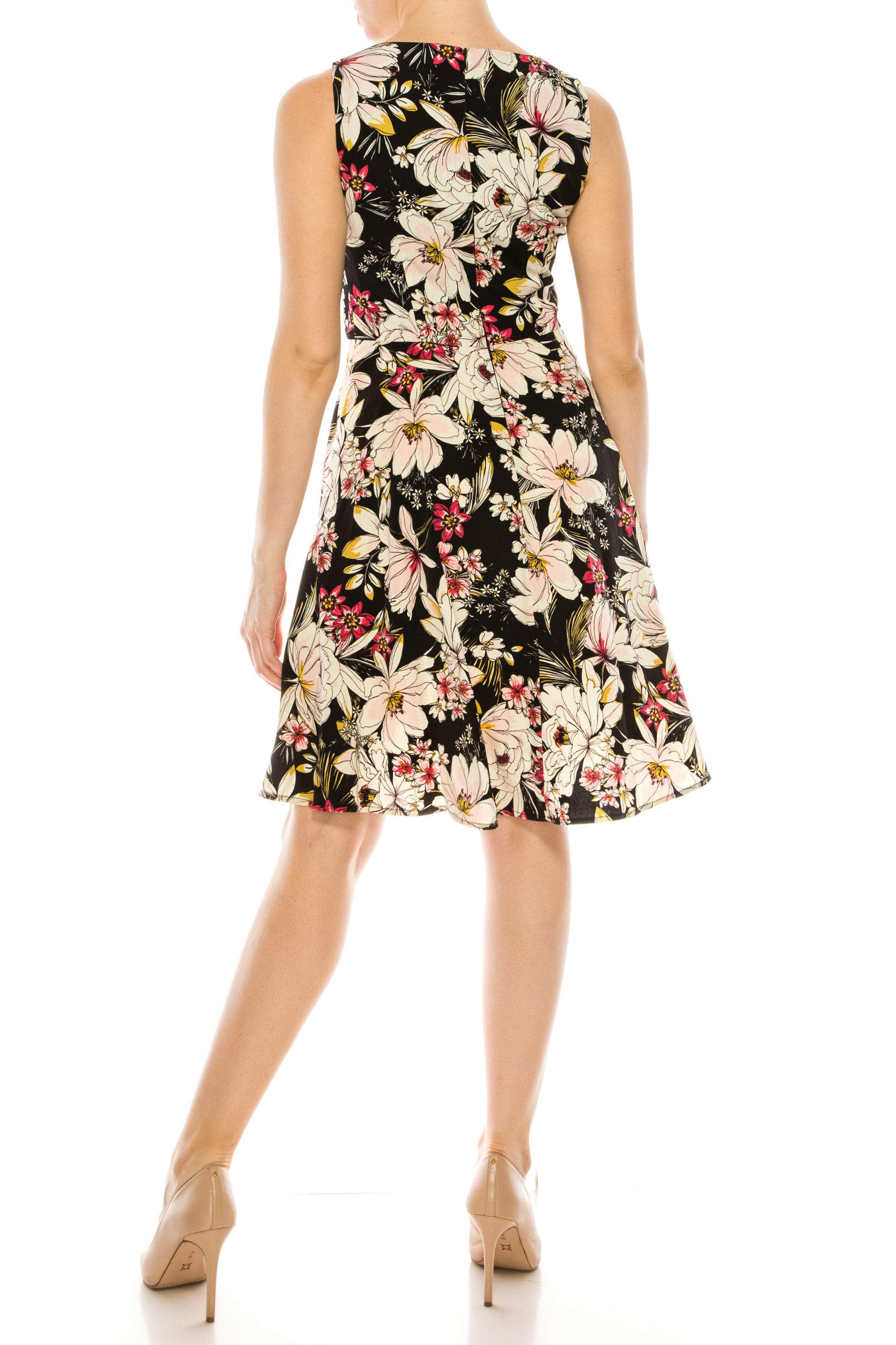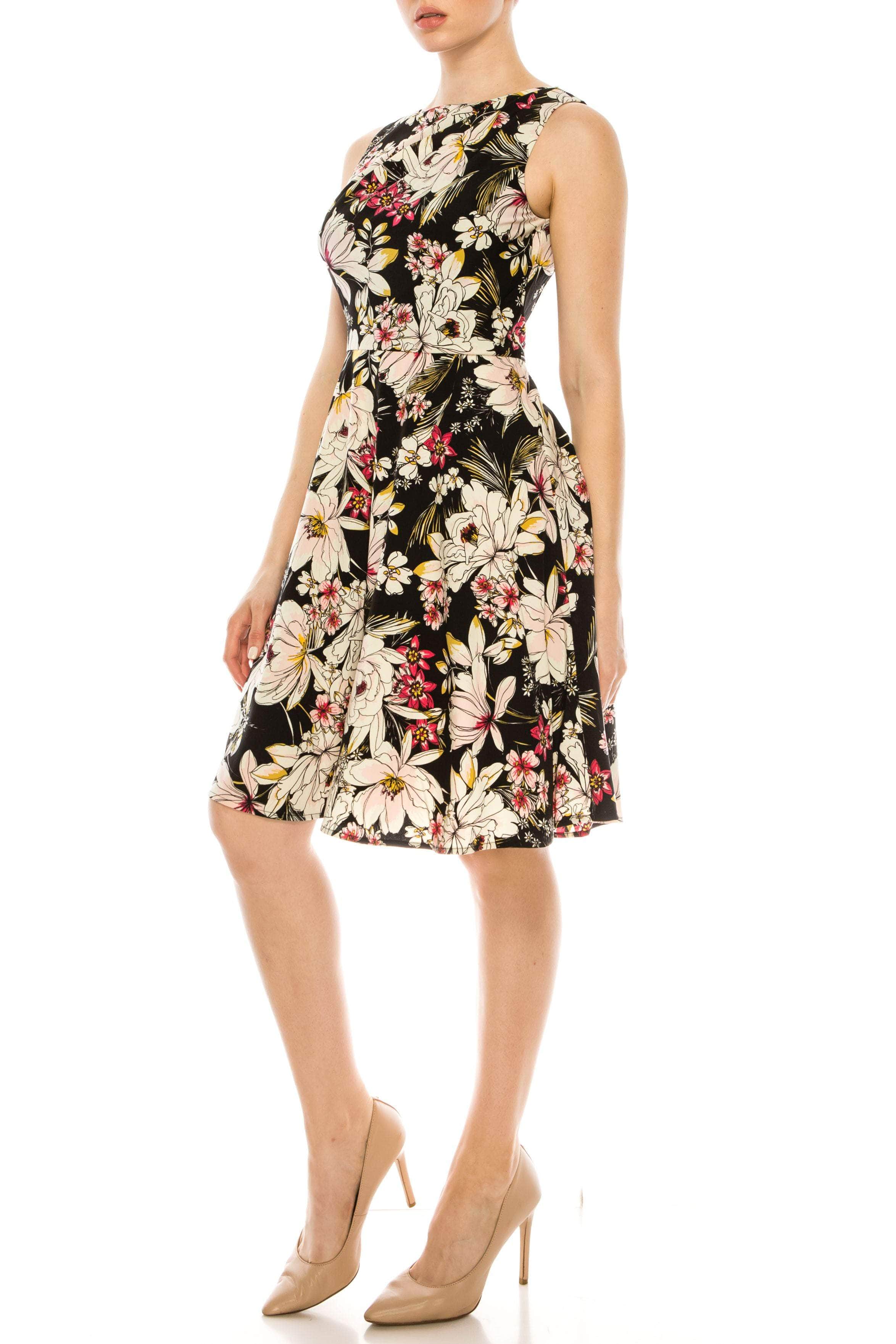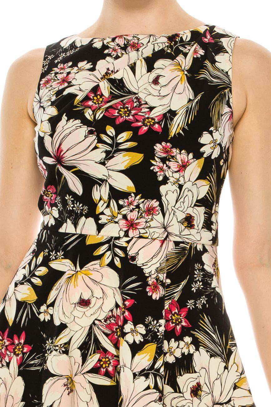 Exude charm and poise when you wear this chic dress by London Times T3730M. This floral printed sleeveless dress features a bateau neckline accented by asymmetrical pleats across the bodice and has a zipper closure. The dress finishes at knee length. Style this London Times dress from day to date night with a pointed high heel or flat and you are all set for a timeless look. At Couture Candy, looking gorgeous and making head turns have been made easy by our discount dresses on sale from hottest and trendiest evening gowns, special occasions, prom dresses, formal gowns, mother of the bride, sweet 16, and cocktail dresses. Model is wearing Black Pink color.