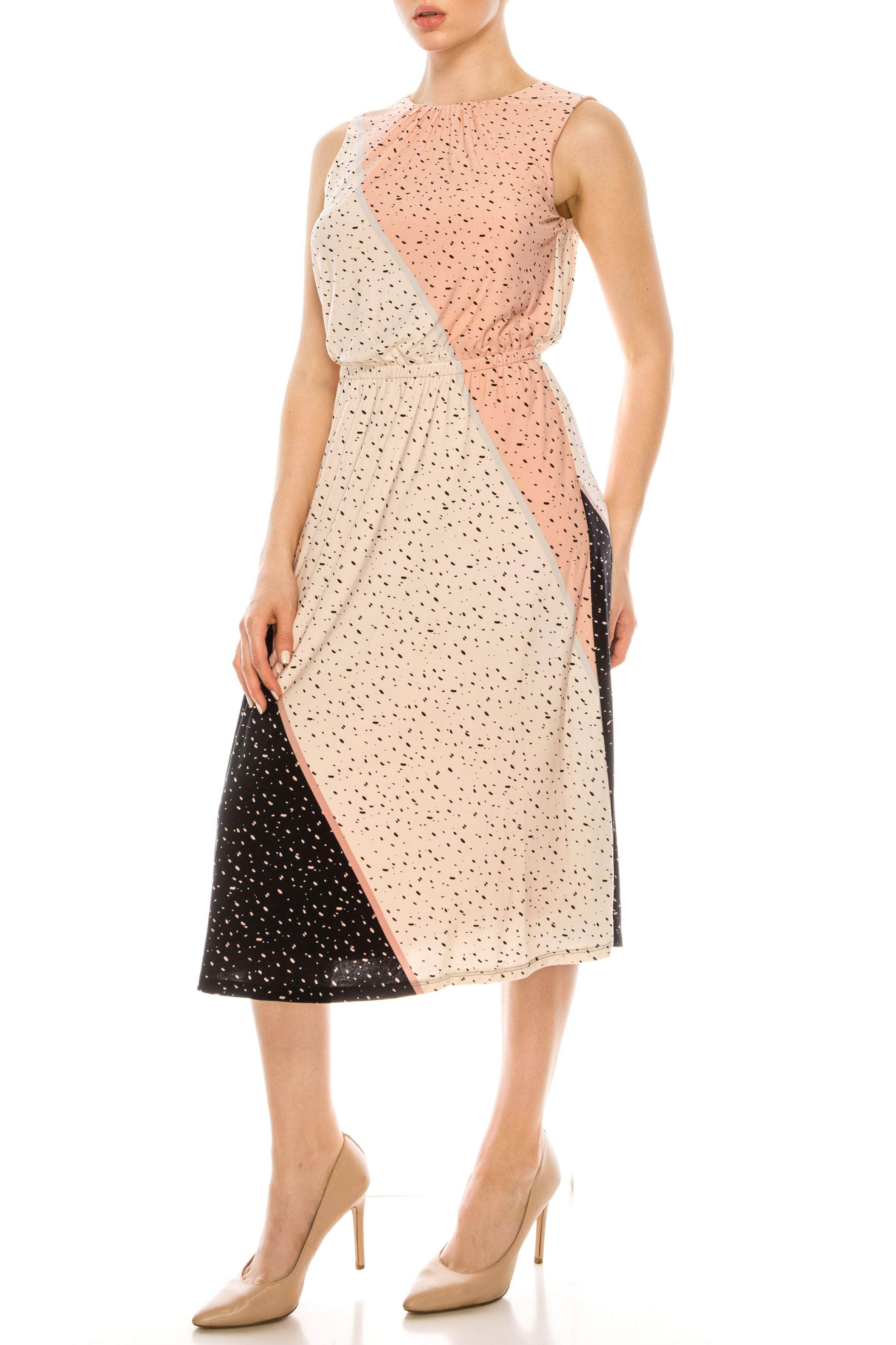 Bloom with beauty and love in this dainty dress by London Times T5633M. Designed in an asymmetrical multi print, this sleeveless piece features a jewel neckline with pleat details and complemented with a keyhole at the back and an elastic waistband. The skirt flows gracefully and finishes in a tea length hemline. Radiate a fresh style in this London Times creation. At Couture Candy, looking gorgeous and making head turns have been made easy by our discount dresses on sale from hottest and trendiest evening gowns, special occasions, prom dresses, formal gowns, mother of the bride, sweet 16, and cocktail dresses. Model is wearing Cream Peach color.