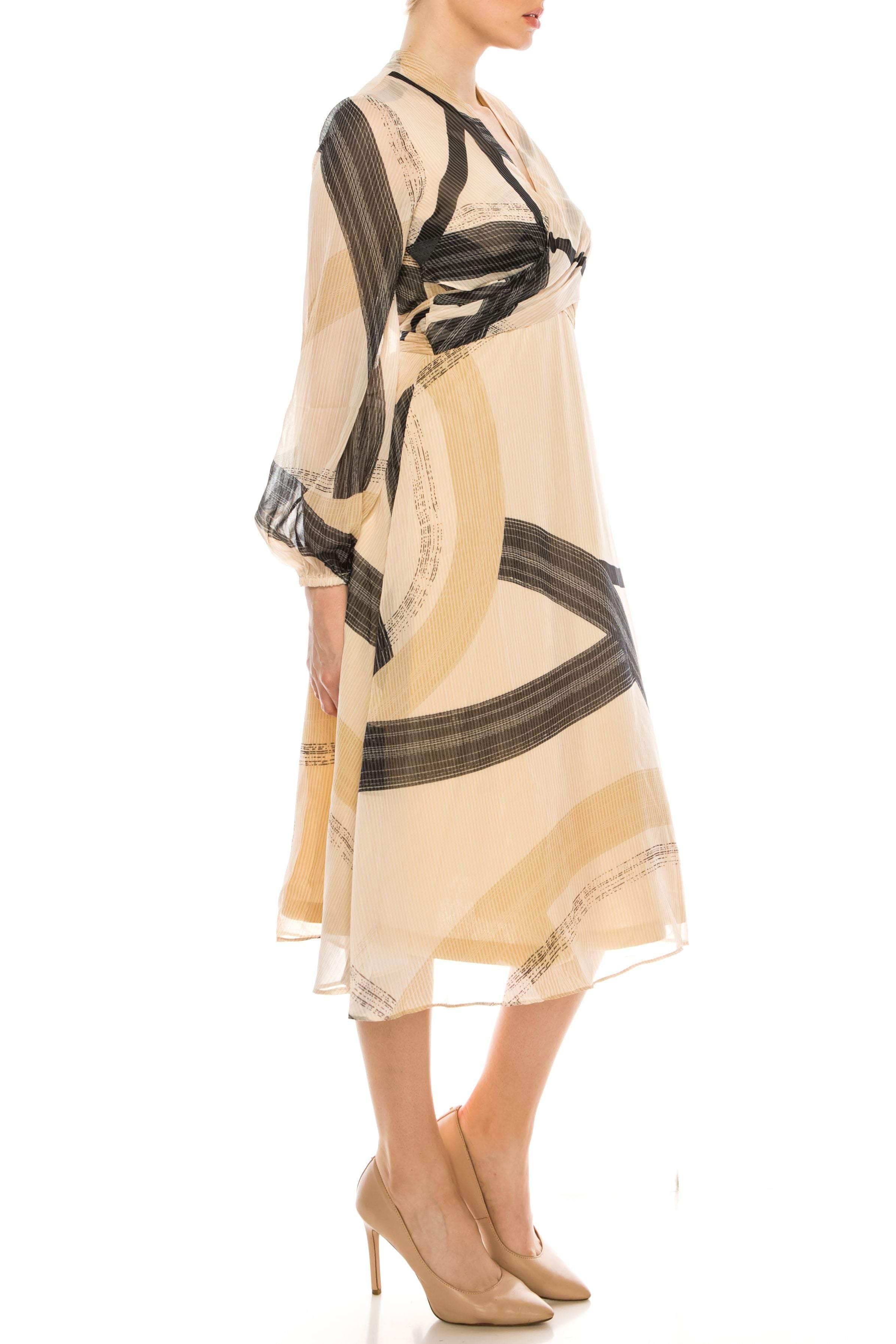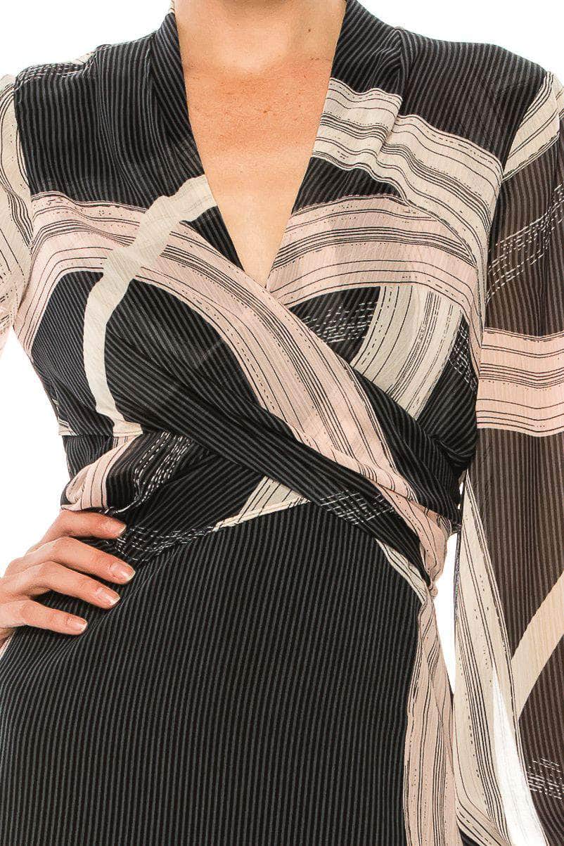 Look fantastic for your next formal event in this evening gown by London Times T5660M. This chiffon dress graces in abstract print and features a V-neck long sleeved on a faux wrap bodice trailing to a tied waistband at the back. The skirt reveals an A-line silhouette and finishes at tea-length hem. London Times will let you shine like the star that you are. At Couture Candy, looking gorgeous and making head turns have been made easy by our discount dresses on sale from hottest and trendiest evening gowns, special occasions, prom dresses, formal gowns, mother of the bride, sweet 16, and cocktail dresses. Model is wearing Tan Khaki, and Black Pink colors.