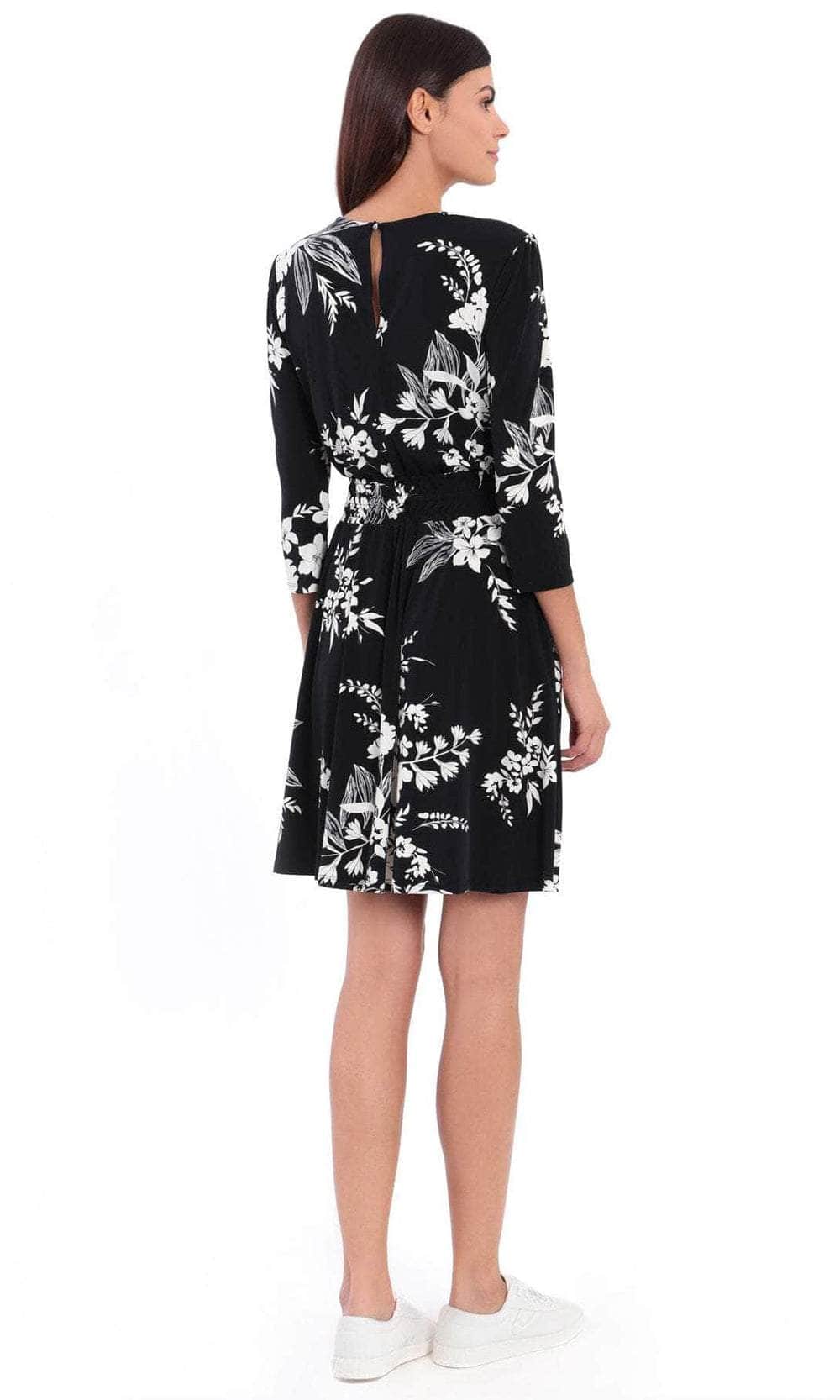 Make magic in this fantastic creation from London Times T5677M. Gorgeously textured with a floral print on a fit and flare bodice, this piece shows off a jewel neckline and quarter sleeves. Embraced with a smocked waist, the back reveals a keyhole cutout. The A-line skirt runs at short length hemline. This London Times dress will let you celebrate that divine feminine beauty! Couture Candy is committed to provide the very best when it comes to dresses for every occasion, and we are delighted to have London Times on our side to aid us in delivering exquisite dresses for various occasions that are sure to make heads turn. Model is wearing the Black/White color.