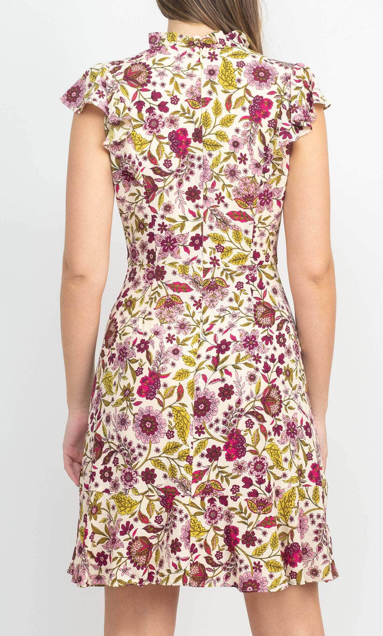 Get ready for everyone to stop and stare when you show up in this London Times T5818M. The ruffle cap sleeves and floral print create a romantic and elegant look, while the ruched waist and back zipper add a touch of sophistication and glamour. The short length and natural V-neckline creates a playful vibe that's perfect for a daytime event or a night out. With the A-line style that modestly flares out, Draw out the princess in you with this London Times T5818M! Model is wearing Beige Pink color.