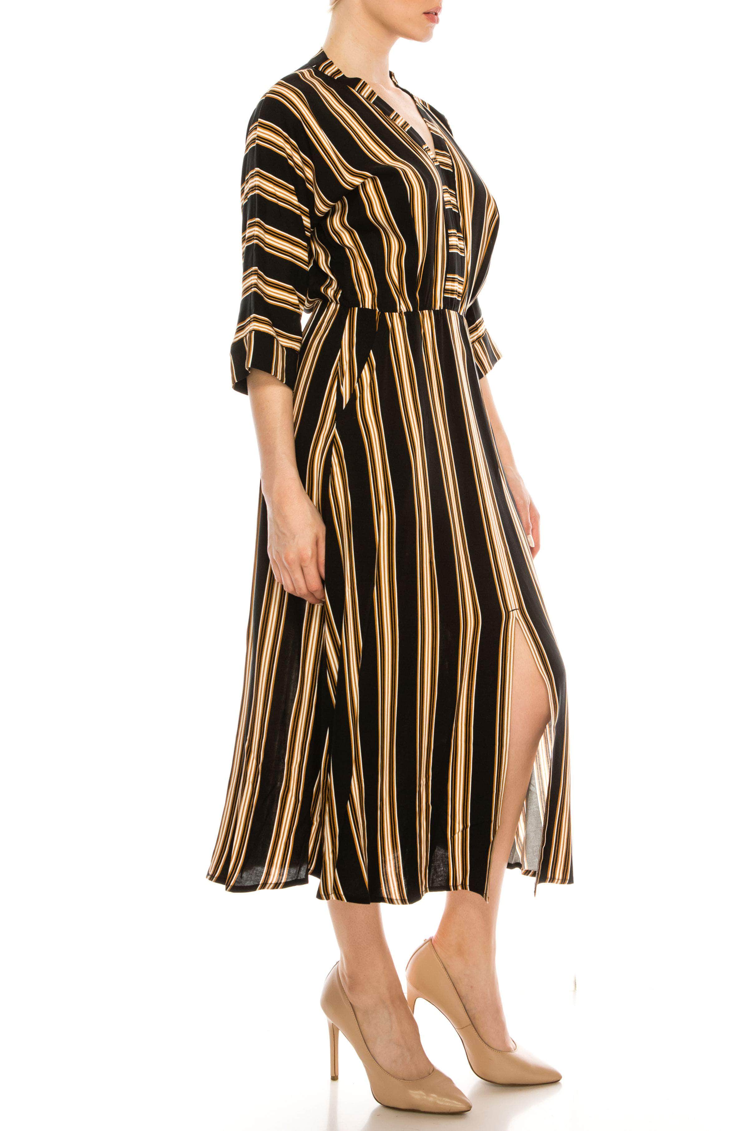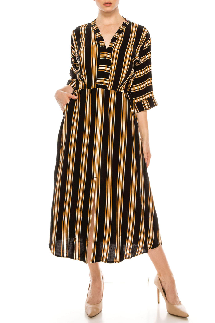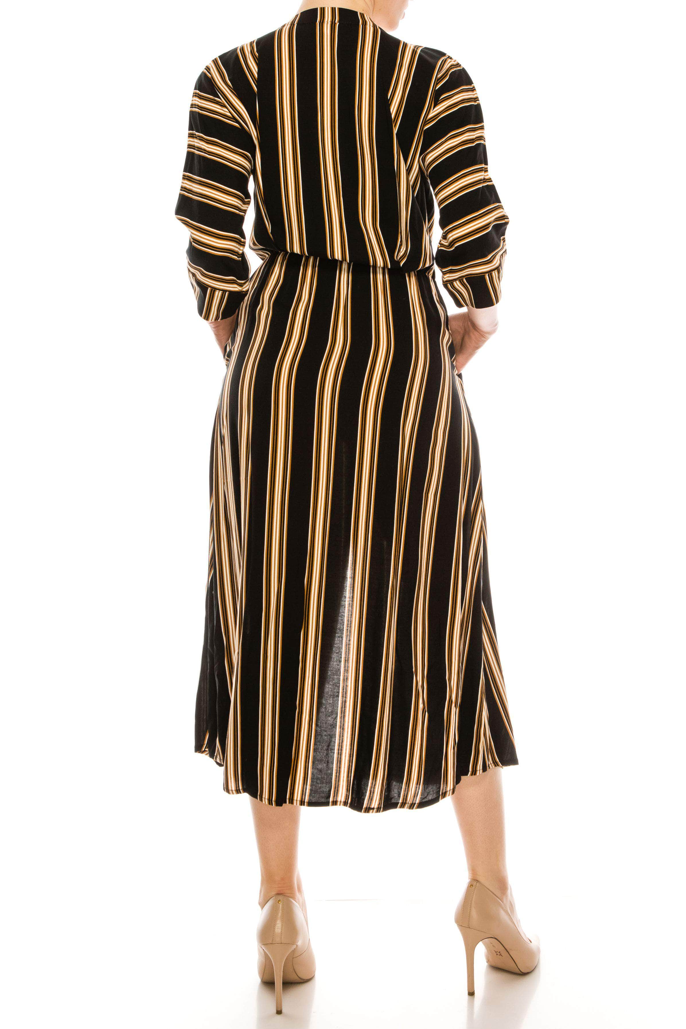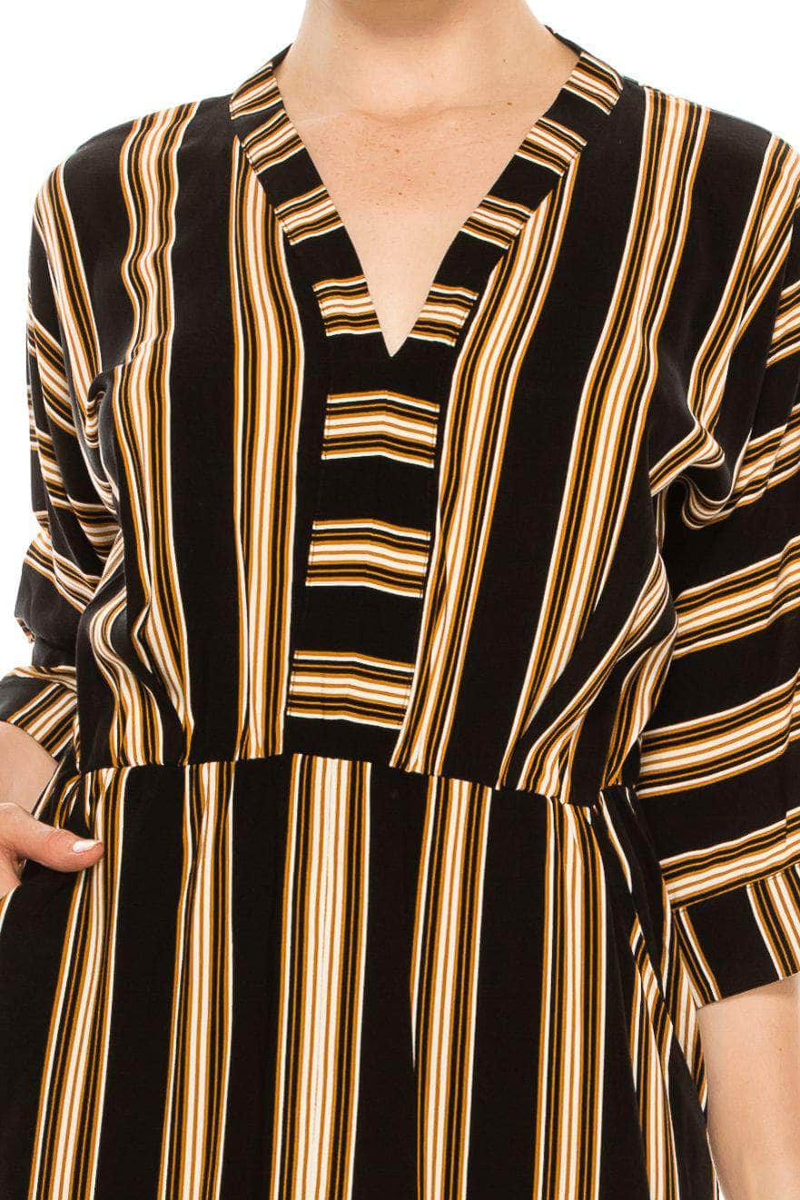 Make a statement with this chic dress from London Times T5880M. Fashioned in a striped printed dress, this piece displays a quarter length sleeves with V-neckline and an elastic waistband. It has a lovely A-line silhouette skirt with side pockets on both sides and a front slit. Get ready to shine in this London Times creation. At Couture Candy, looking gorgeous and making head turns have been made easy by our discount dresses on sale from hottest and trendiest evening gowns, special occasions, prom dresses, formal gowns, mother of the bride, sweet 16, and cocktail dresses. Model is wearing Black White color.