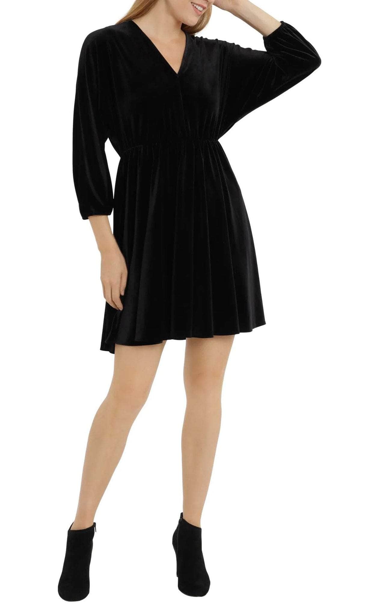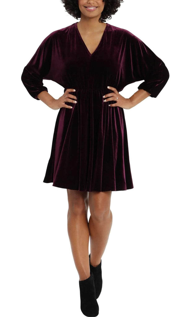 Look fantastic for your next formal event in this dress by London Times T5911M. The long sleeves with elastic cuffs, elastic waist, and luxurious velvet fabric create a look that's both chic and comfortable. The enclosed back adds a touch of elegance and sophistication, while the short length and natural V-neckline create a classic vibe that's perfect for a party or a special event. Get noticed in any crowd wearing this London Times T5911M masterpiece! Model is wearing Aubergine and Black colors.