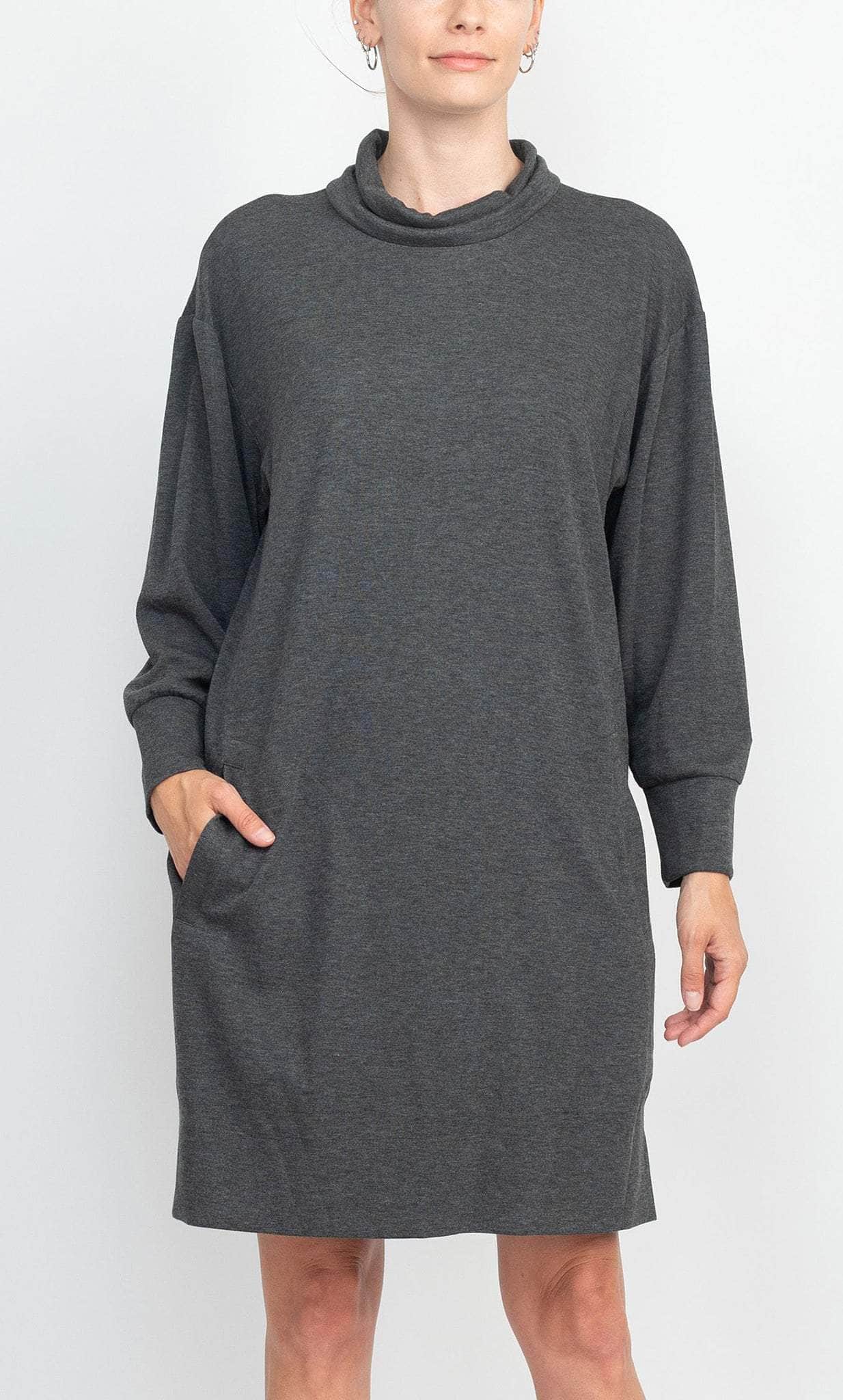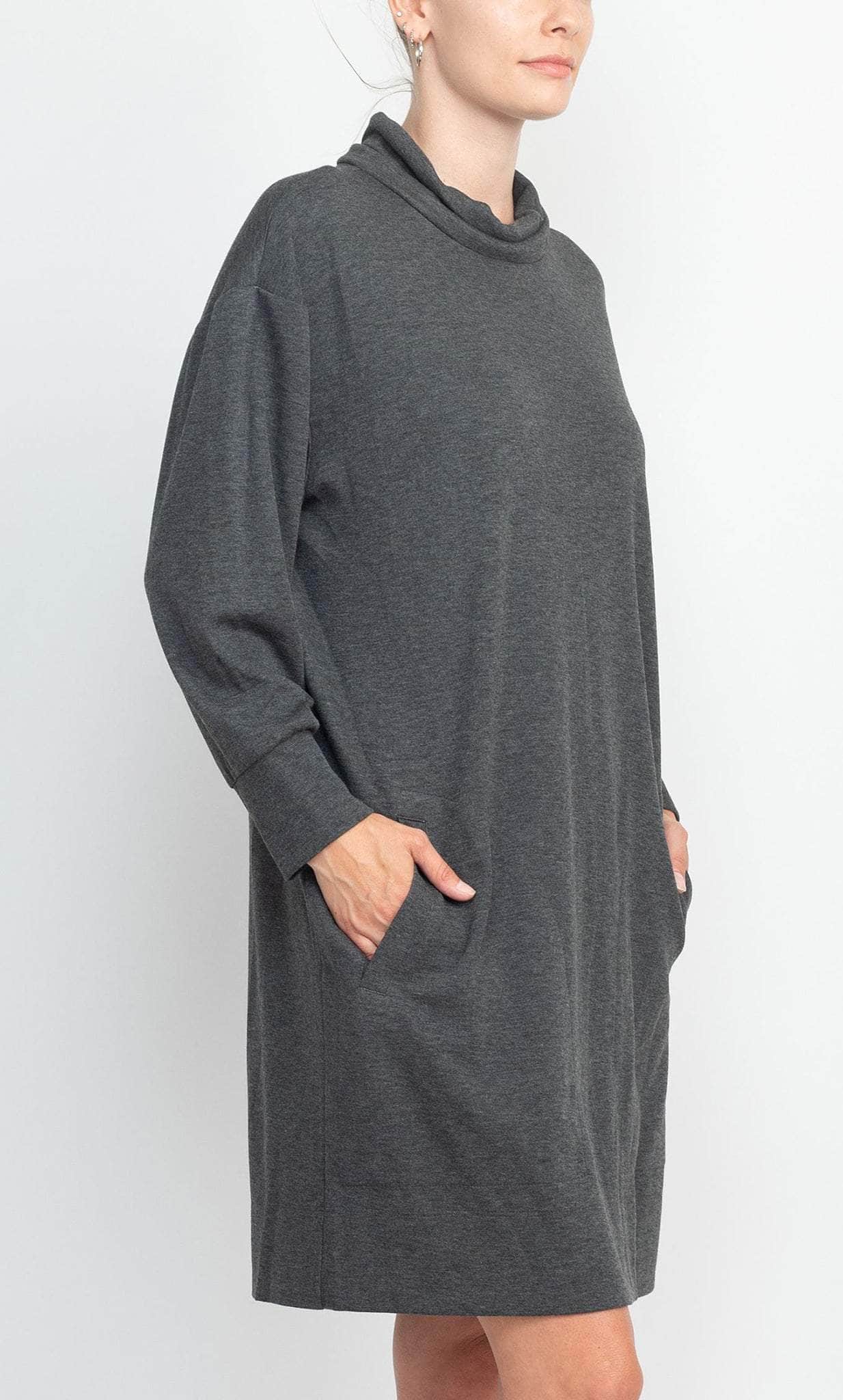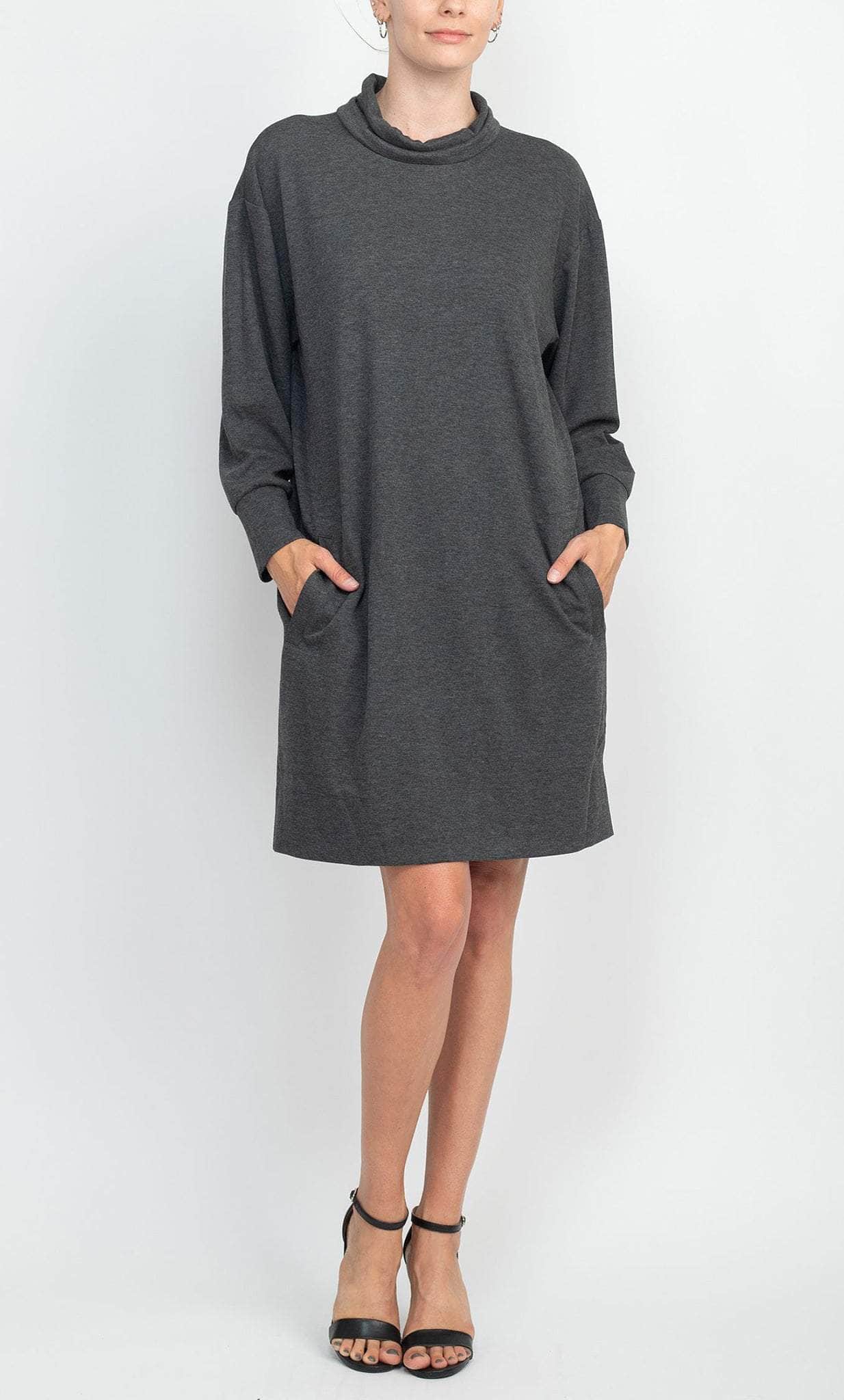 You are a mystery in this masterpiece from London Times T5923M. This charming short sheath dress features a cozy knit fabric and long sleeves to keep you warm and stylish. The closed back design provides a clean and elegant look, while the pockets add a practical touch. The turtleneck neckline adds a touch of sophistication and class to the overall design. Showcase your brilliant esprit in this bellissima London Times T5923M! Model is wearing Charcoal Heather color.