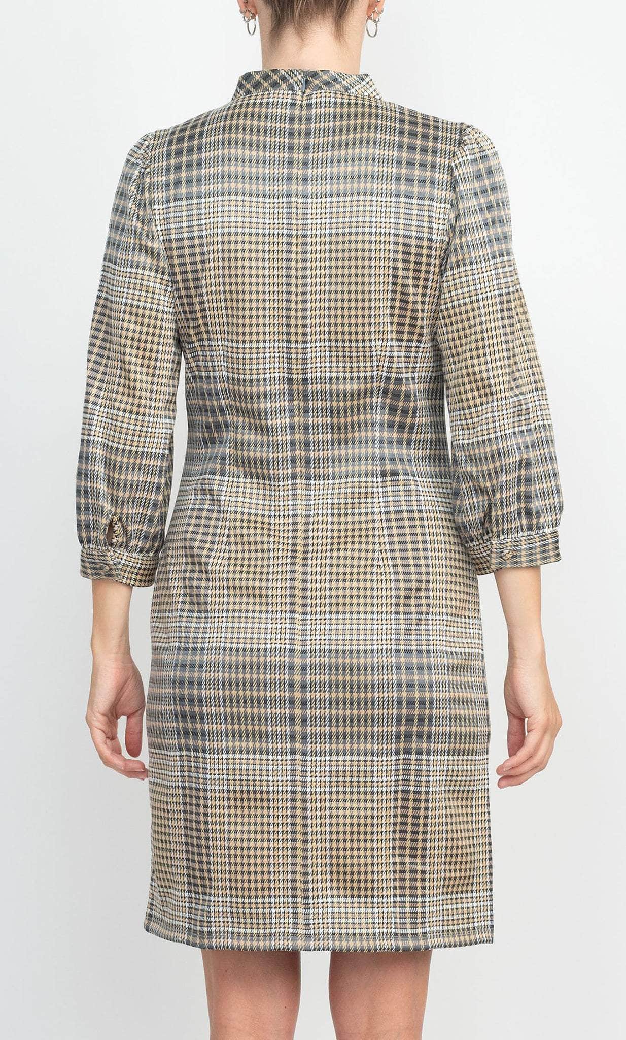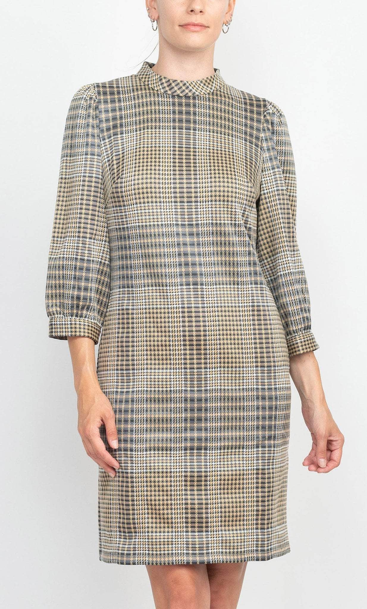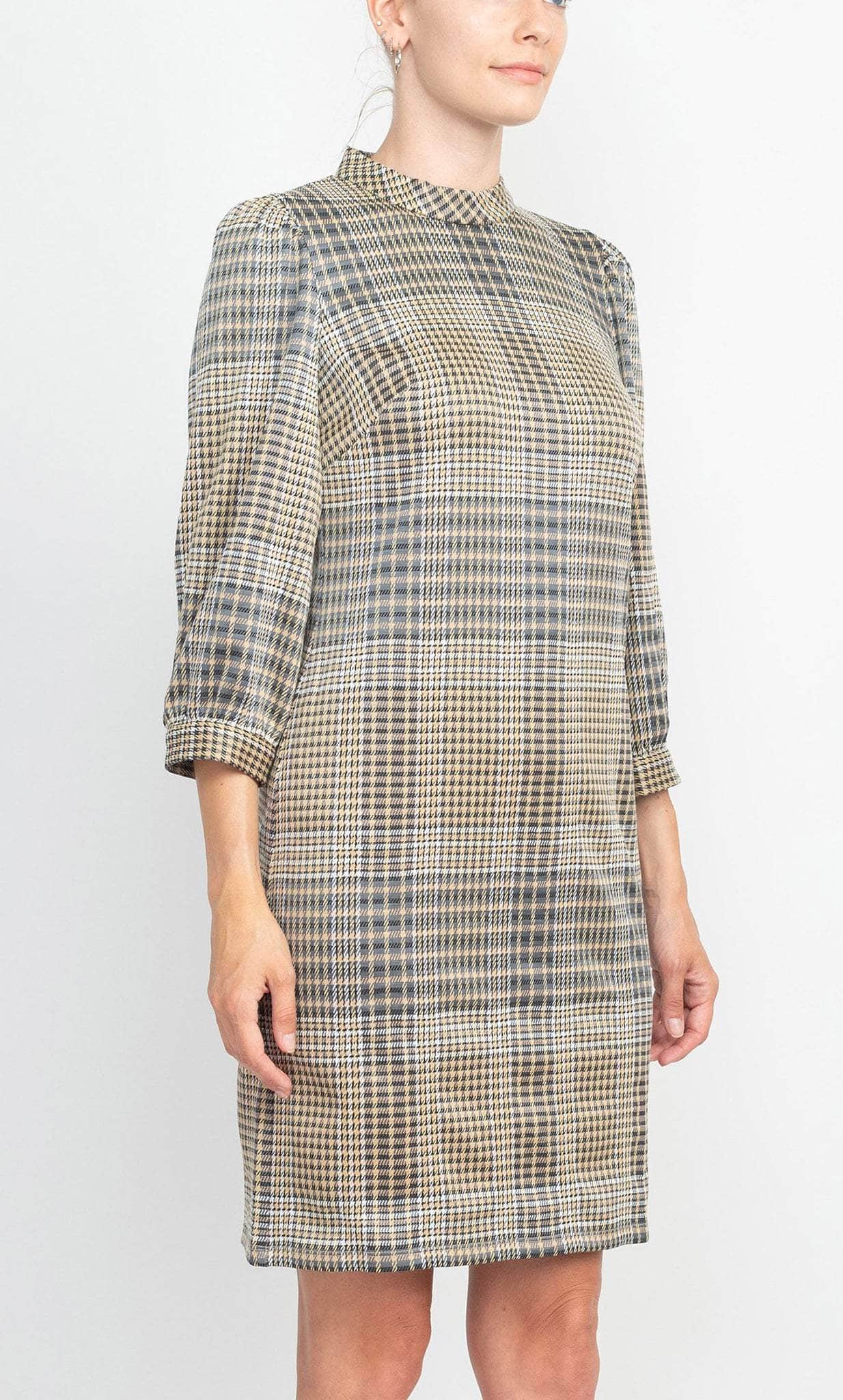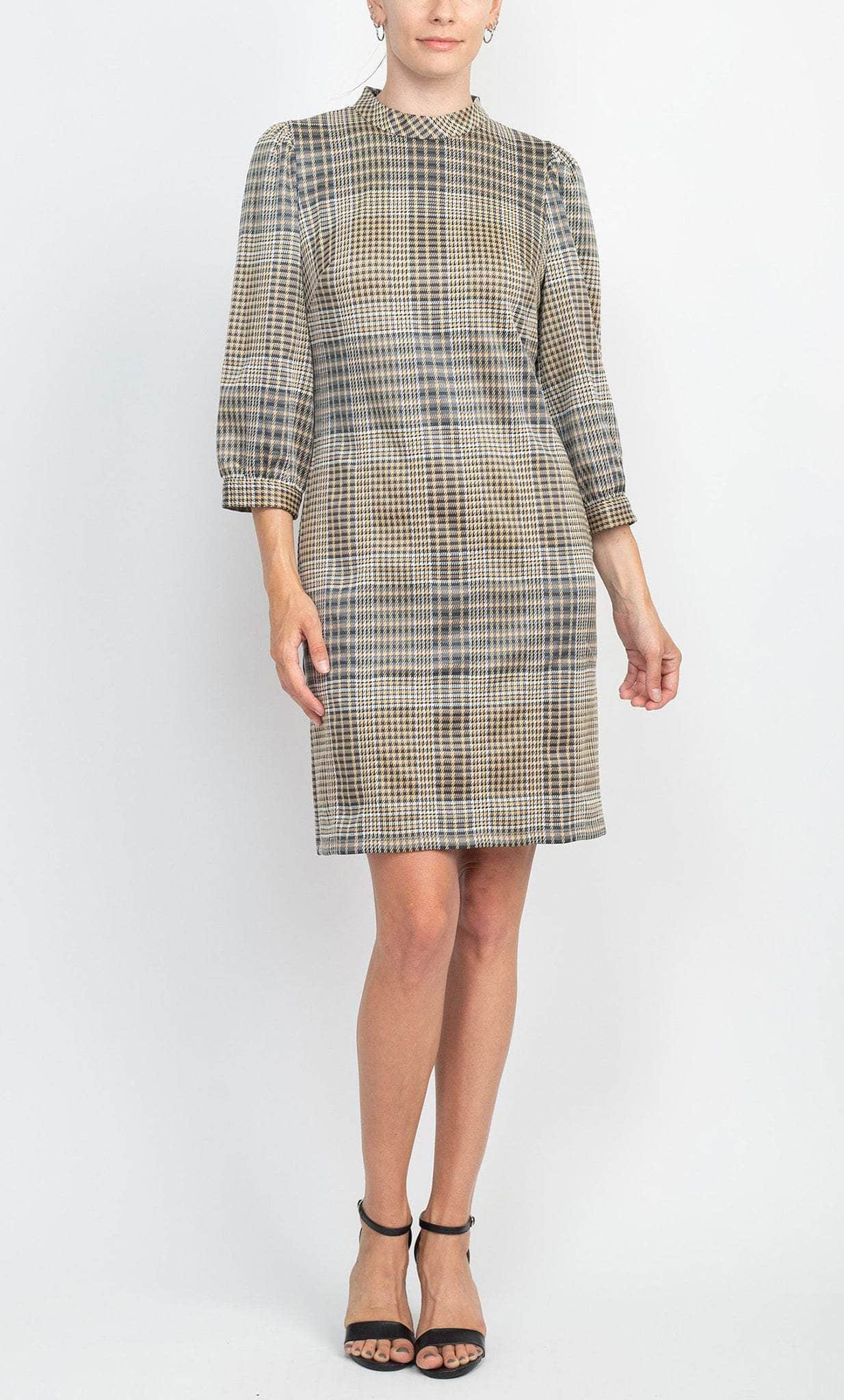 Show off your trendsetting style when you wear this London Times T5954M. Introducing a stunning short sheath dress that will leave you feeling confident and stylish. Featuring long bishop sleeves that add an elegant touch to the overall design, this dress is made of a checkered fabric that brings a classic and timeless feel. The enclosed back gives the dress a modest look, while the button detailing adds a touch of sophistication. Make a splash with this London Times T5954M short dress! Model is wearing Beige color.