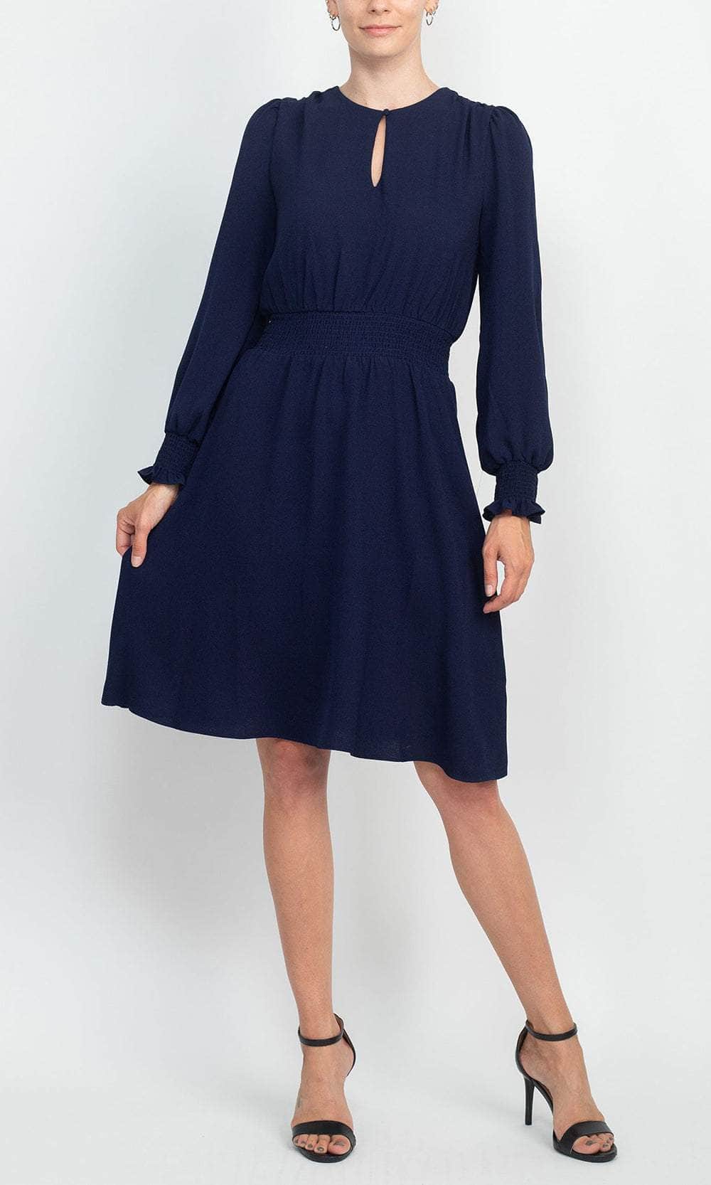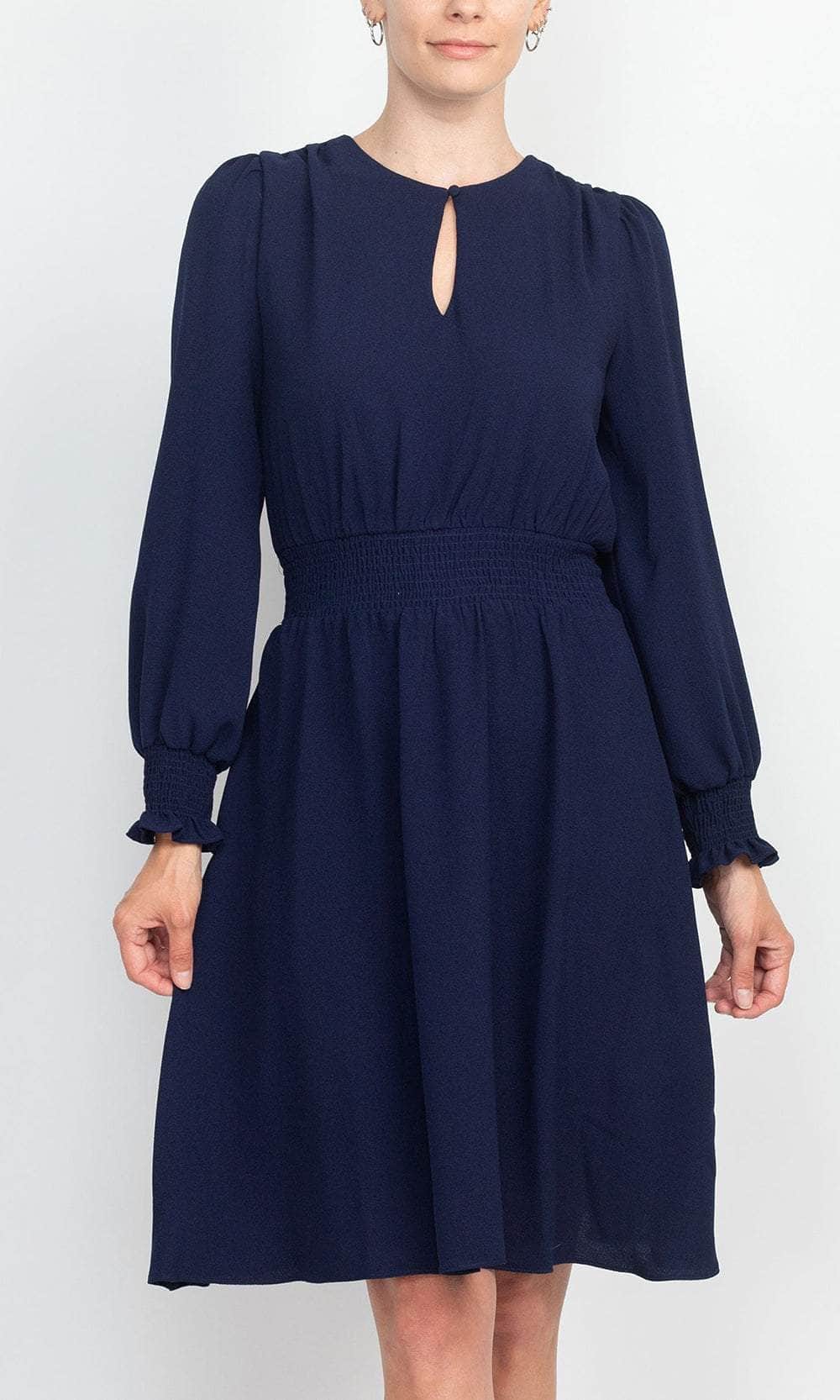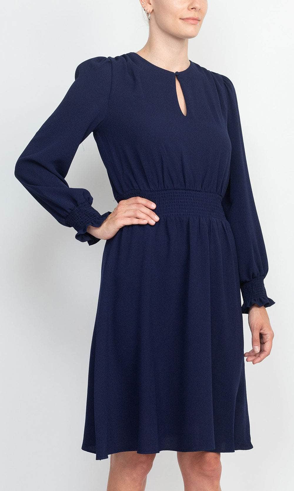 Get primed to climb that social ladder in this gorgeously tailored London Times T5985M creation. Sculpting with tailoring lines on a vibrantly hued crepe silhouette, this stunner parades a jewel neckline with a button accent and a keyhole cutout. Designed with a full back and frames with bishop sleeves and elastic cuffs. Nipped at the waist, the skirt flares into a knee length hemline. Indulge in appreciative glances when you flaunt this London Times masterpiece. Models are wearing the Chili, Wild Rose and Navy colors.