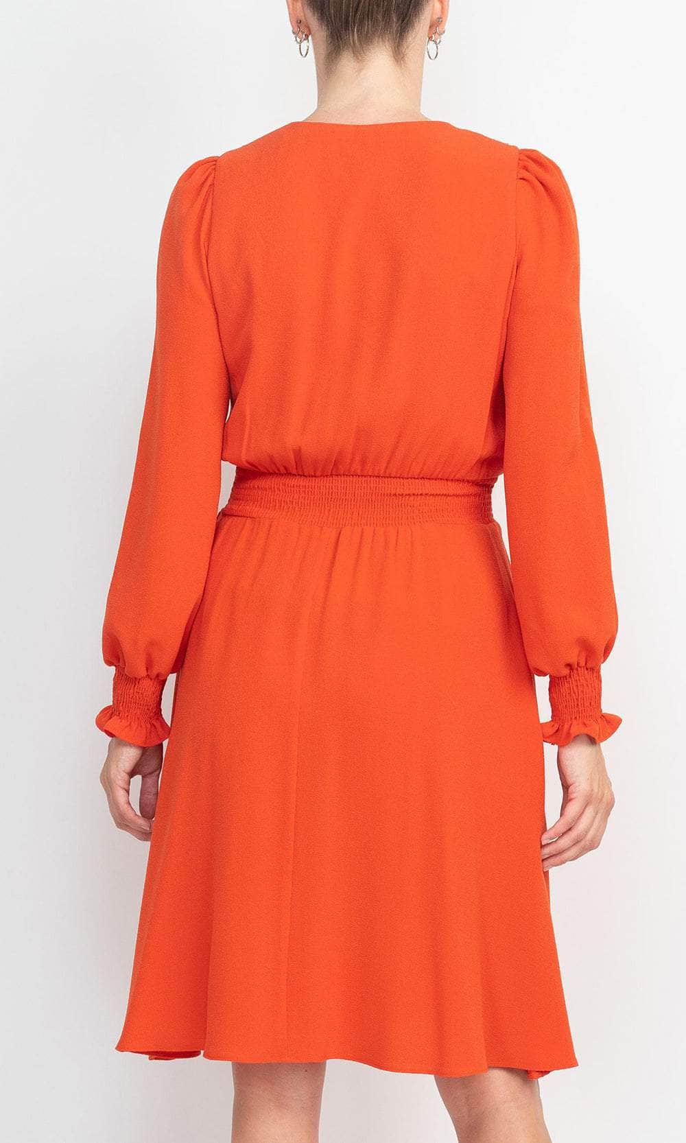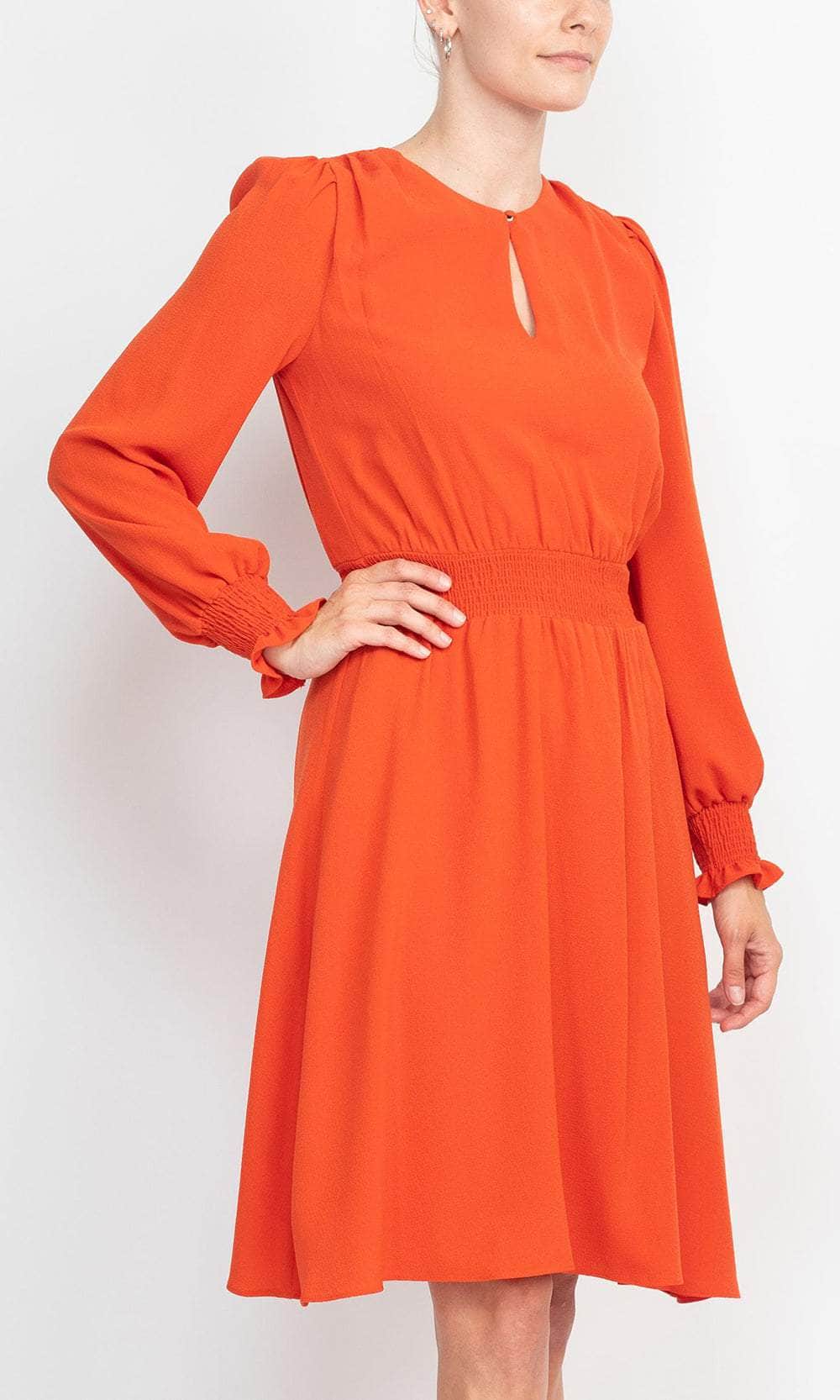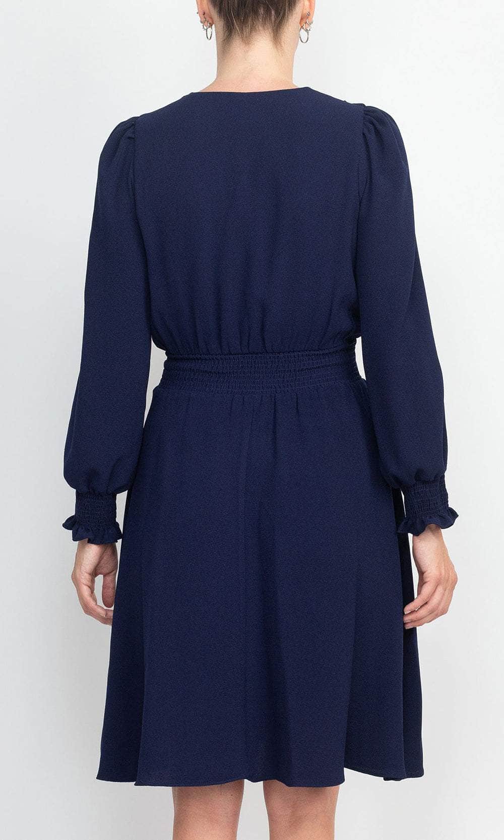Get primed to climb that social ladder in this gorgeously tailored London Times T5985M creation. Sculpting with tailoring lines on a vibrantly hued crepe silhouette, this stunner parades a jewel neckline with a button accent and a keyhole cutout. Designed with a full back and frames with bishop sleeves and elastic cuffs. Nipped at the waist, the skirt flares into a knee length hemline. Indulge in appreciative glances when you flaunt this London Times masterpiece. Models are wearing the Chili, Wild Rose and Navy colors.